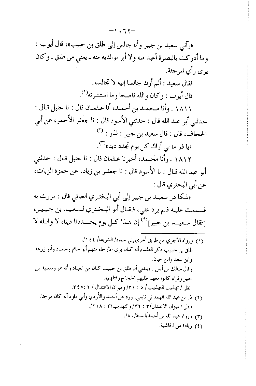1812 - وَأَنَا مُحَمَّدٌ، أَخْبَرَنَا عُثْمَانُ، قَالَ: نَا حَنْبَلٌ، قَالَ: حَدَّثَنِي أَبُو عَبْدِ اللَّهِ، قَالَ: نا الْأَسْوَدُ، قَالَ: نا جَعْفَرُ بْنُ زِيَادٍ، عَنْ حَمْزَةَ الزَّيَّاتِ، عَنْ أَبِي الْبَخْتَرِيِّ، قَالَ: شَكَا ذَرٌّ سَعِيدَ بْنَ جُبَيْرٍ إِلَى أَبِي الْبَخْتَرِيِّ الطَّائِيِّ قَالَ: مَرَرْتُ بِهِ فَسَلَّمْتُ عَلَيْهِ فَلَمْ يَرُدَّ عَلَيَّ، فَقَالَ أَبُو الْبَخْتَرِيِّ لِسَعِيدِ بْنِ جُبَيْرٍ، فَقَالَ سَعِيدُ بْنُ جُبَيْرٍ: «§إِنَّ هَذَا كُلَّ يَوْمٍ يُجَدِّدُ دِينًا، لَا وَاللَّهِ لَا -[1063]- أُكَلِّمُهُ أَبَدًا»