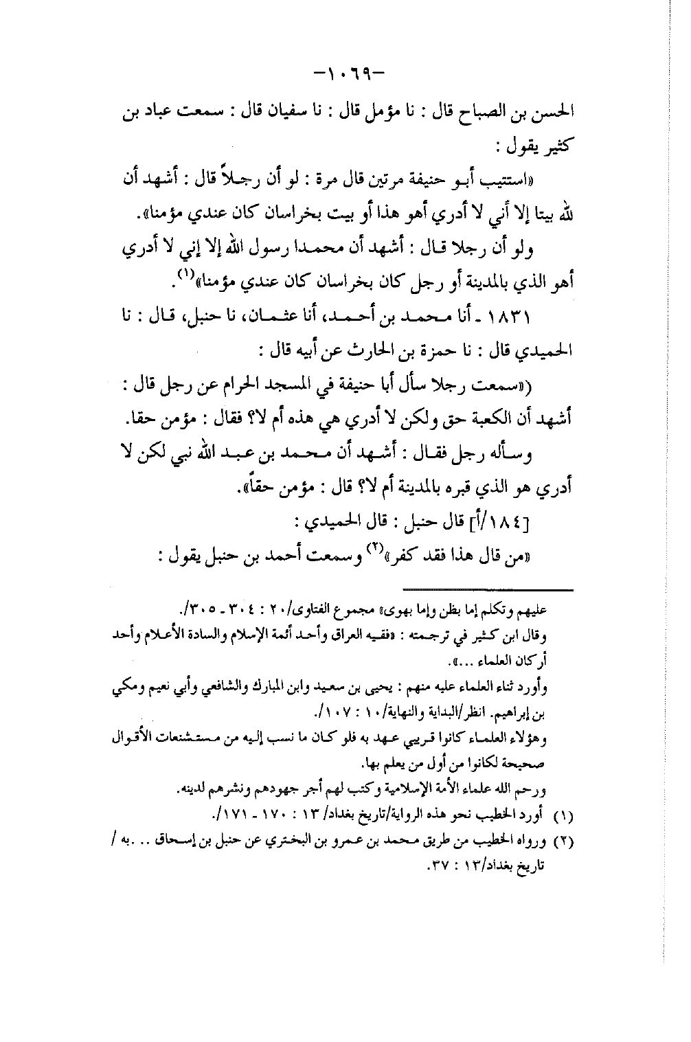 1831 - أنا مُحَمَّدُ بْنُ أَحْمَدَ، أنا عُثْمَانُ، نا حَنْبَلٌ، قَالَ: نا الْحُمَيْدِيُّ، قَالَ: نا حَمْزَةُ بْنُ الْحَارِثِ، عَنْ أَبِيهِ، قَالَ: " سَمِعْتُ رَجُلًا سَأَلَ أَبَا حَنِيفَةَ فِي الْمَسْجِدِ الْحَرَامِ عَنْ رَجُلٍ قَالَ: §أَشْهَدُ أَنَّ الْكَعْبَةَ حَقٌّ وَلَكِنْ لَا أَدْرِي هِيَ هَذِهِ أَمْ لَا؟ فَقَالَ: مُؤْمِنٌ حَقًّا، وَسَأَلَهُ رَجُلٌ فَقَالَ: أَشْهَدُ أَنَّ مُحَمَّدَ بْنَ عَبْدِ اللَّهِ نَبِيٌّ لَكِنْ لَا أَدْرِي هُوَ الَّذِي قَبْرُهُ بِالْمَدِينَةِ أَمْ لَا؟ قَالَ: مُؤْمِنٌ حَقًّا " قَالَ حَنْبَلٌ: قَالَ الْحُمَيْدِيُّ: «مَنْ قَالَ هَذَا فَقَدْ كَفَرَ» وَسَمِعْتُ أَحْمَدَ بْنَ حَنْبَلٍ يَقُولُ -[1070]-: «مَنْ قَالَ هَذَا فَقَدْ كَفَرَ»