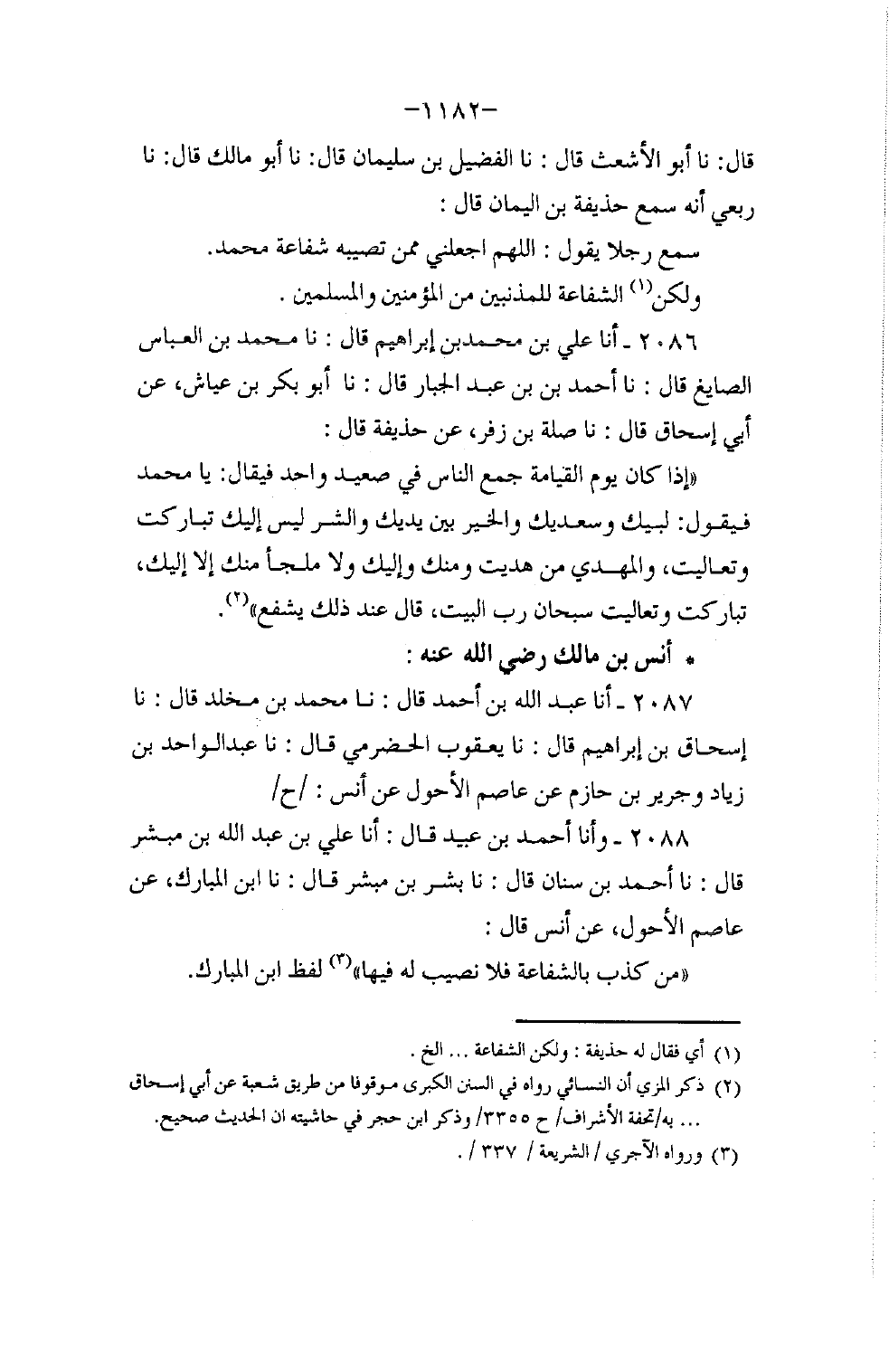 2088 - وَأَنَا أَحْمَدُ بْنُ عُبَيْدٍ، قَالَ: أنا عَلِيُّ بْنُ عَبْدِ اللَّهِ بْنِ مُبَشِّرٍ، قَالَ: نا أَحْمَدُ بْنُ سِنَانٍ، قَالَ: نا بِشْرُ بْنُ مُبَشِّرٍ، قَالَ: نا ابْنُ الْمُبَارَكِ، عَنْ عَاصِمٍ الْأَحْوَلِ، عَنْ أَنَسٍ، قَالَ: §«مَنْ كَذَّبَ بِالشَّفَاعَةِ فَلَا نَصِيبَ لَهُ فِيهَا» لَفْظُ ابْنِ الْمُبَارَكِ