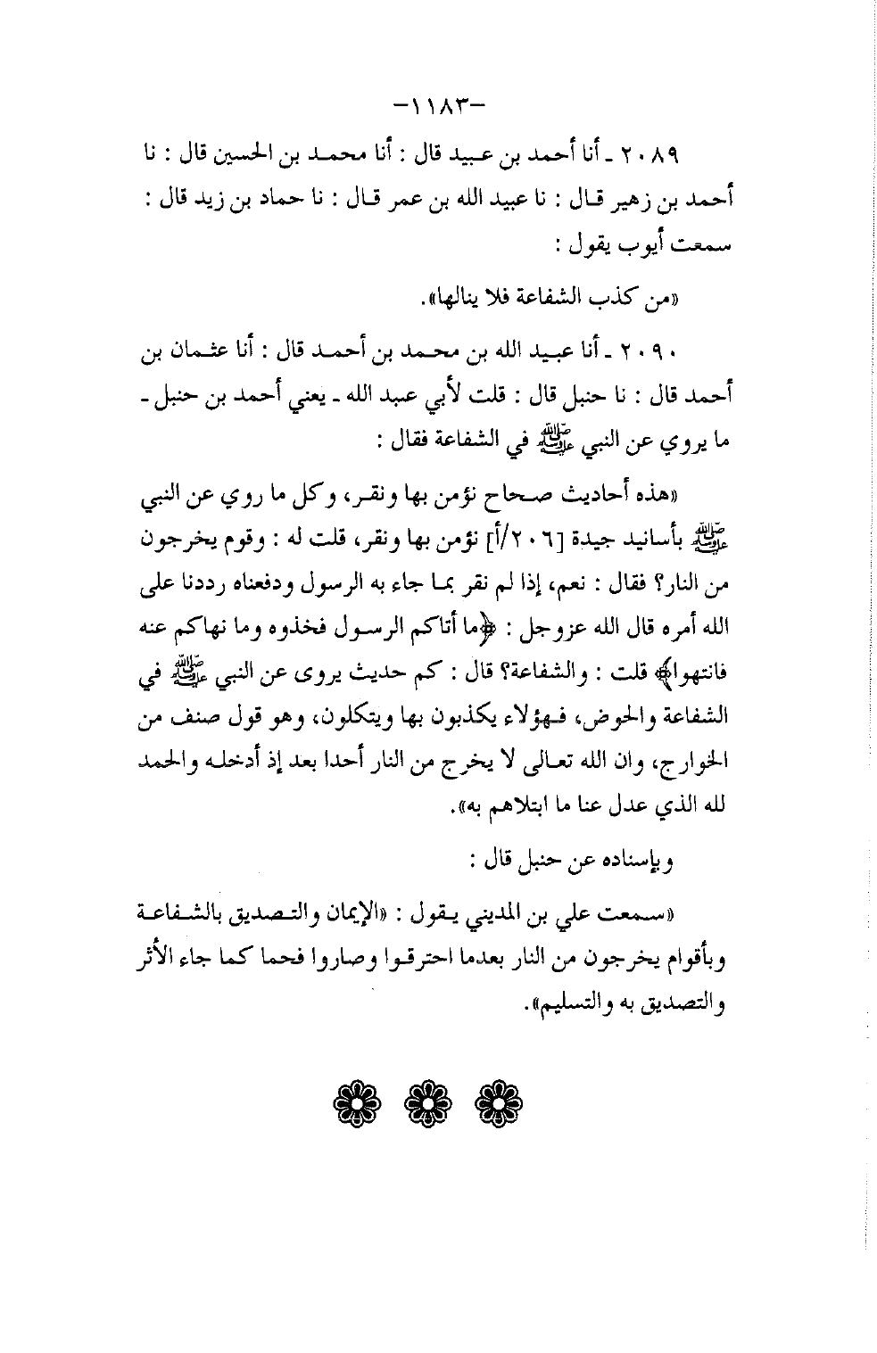 2090 - أنا عُبَيْدُ اللَّهِ بْنُ مُحَمَّدِ بْنِ أَحْمَدَ، قَالَ: أنا عُثْمَانُ بْنُ أَحْمَدَ، قَالَ: نا حَنْبَلٌ، قَالَ: قُلْتُ لِأَبِي عَبْدِ اللَّهِ يَعْنِي أَحْمَدَ بْنَ حَنْبَلٍ: §مَا يُرْوَى عَنِ النَّبِيِّ صَلَّى اللهُ عَلَيْهِ وَسَلَّمَ فِي الشَّفَاعَةِ؟ فَقَالَ: " هَذِهِ أَحَادِيثُ صِحَاحٌ نُؤْمِنُ بِهَا وَنُقِرُّ، وَكُلُّ مَا رُوِيَ عَنِ النَّبِيِّ صَلَّى اللهُ عَلَيْهِ وَسَلَّمَ بِأَسَانِيدَ جَيِّدَةٍ نُؤْمِنُ بِهَا وَنُقِرُّ، قُلْتُ لَهُ: وَقَوْمٌ يَخْرُجُونَ مِنَ النَّارِ؟ فَقَالَ: نَعَمْ، إِذَا لَمْ نُقِرَّ بِمَا جَاءَ بِهِ الرَّسُولُ وَدَفَعْنَاهُ رَدَدْنَا عَلَى اللَّهِ أَمْرَهُ قَالَ اللَّهُ عَزَّ وَجَلَّ: {وَمَا آتَاكُمُ الرَّسُولُ فَخُذُوهُ وَمَا نَهَاكُمْ عَنْهُ فَانْتَهُوا} [الحشر: 7] قُلْتُ: وَالشَّفَاعَةُ؟ قَالَ: كَمْ حَدِيثٍ يُرْوَى عَنِ النَّبِيِّ صَلَّى اللهُ عَلَيْهِ وَسَلَّمَ فِي الشَّفَاعَةِ وَالْحَوْضِ، فَهَؤُلَاءِ يُكَذِّبُونَ بِهَا وَيَتَكَلَّمُونَ، وَهُوَ قَوْلُ صِنْفٍ مِنَ الْخَوَارِجِ، وَإِنَّ اللَّهَ تَعَالَى لَا يُخْرِجُ مِنَ النَّارِ أَحَدًا بَعْدَ إِذْ أَدْخَلَهُ، وَالْحَمْدُ لِلَّهِ الَّذِي عَدَلَ عَنَّا مَا ابْتَلَاهُمْ بِهِ "