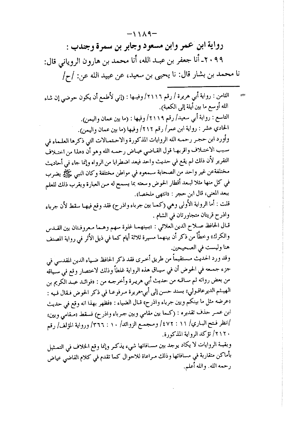 2101 - وَأَنَا مُحَمَّدُ بْنُ الْحُسَيْنِ، وَعُبَيْدُ اللَّهِ بْنُ أَحْمَدَ، قَالَا: أنا الْحُسَيْنُ بْنُ إِسْمَاعِيلَ، قَالَ: نا فَضْلُ بْنُ سَهْلٍ، قَالَ: نا مُحَمَّدُ بْنُ بِشْرٍ، عَنْ عُبَيْدِ اللَّهِ، عَنْ نَافِعٍ، عَنِ ابْنِ عُمَرَ أَنَّ رَسُولَ اللَّهِ صَلَّى اللهُ عَلَيْهِ وَسَلَّمَ قَالَ: §«إِنَّ أَمَامَكُمْ حَوْضًا مَا بَيْنَ» وَفِي حَدِيثِ يَحْيَى «كَمَا بَيْنَ جَرْبَا وَأَذْرُحَ» وَفِي حَدِيثِ فُضَيْلٍ قَالَ: «قَرْيَتَانِ بِالشَّامِ مَا بَيْنَهُمَا مَسِيرَةُ ثَلَاثَةِ أَيَّامٍ»