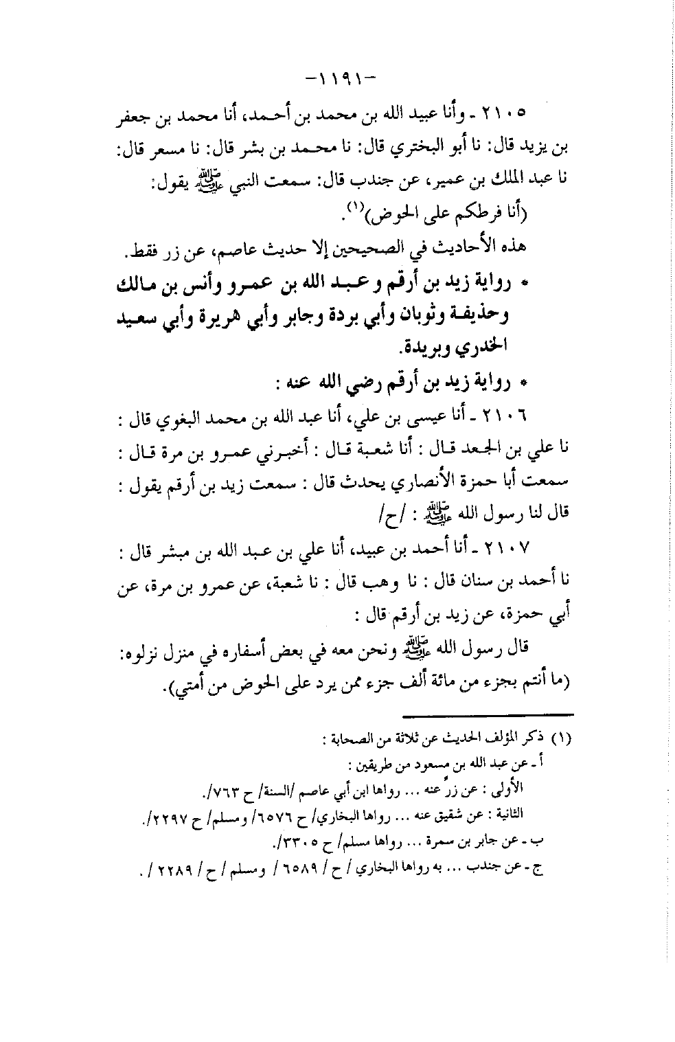 2107 - وَأَنَا أَحْمَدُ بْنُ عُبَيْدٍ، أنا عَلِيُّ بْنُ عَبْدِ اللَّهِ بْنِ مُبَشِّرٍ، قَالَ: نا أَحْمَدُ بْنُ سِنَانٍ، قَالَ: نا وَهْبٌ، قَالَ: نا شُعْبَةُ، عَنْ عَمْرِو بْنِ مُرَّةَ، عَنْ أَبِي حَمْزَةَ، عَنْ زَيْدِ بْنِ أَرْقَمَ، قَالَ: قَالَ رَسُولُ اللَّهِ صَلَّى اللهُ عَلَيْهِ وَسَلَّمَ وَنَحْنُ مَعَهُ فِي بَعْضِ أَسْفَارِهِ فِي مَنْزِلٍ نَزَلُوهُ: §«مَا أَنْتُمْ بِجُزْءٍ مِنْ مِائَةِ أَلْفِ جُزْءٍ مِمَّنْ يَرِدُ عَلَيَّ الْحَوْضَ مِنْ أُمَّتِي» -[1192]- قَالَ أَبُو حَمْزَةَ: فَقُلْتُ لِزَيْدٍ: كَمْ أَنْتُمْ؟ قَالَ: ثَمَانِ مِائَةٍ أَوْ تِسْعُ مِائَةٍ. أَخْرَجَهُ الْبُخَارِيُّ
