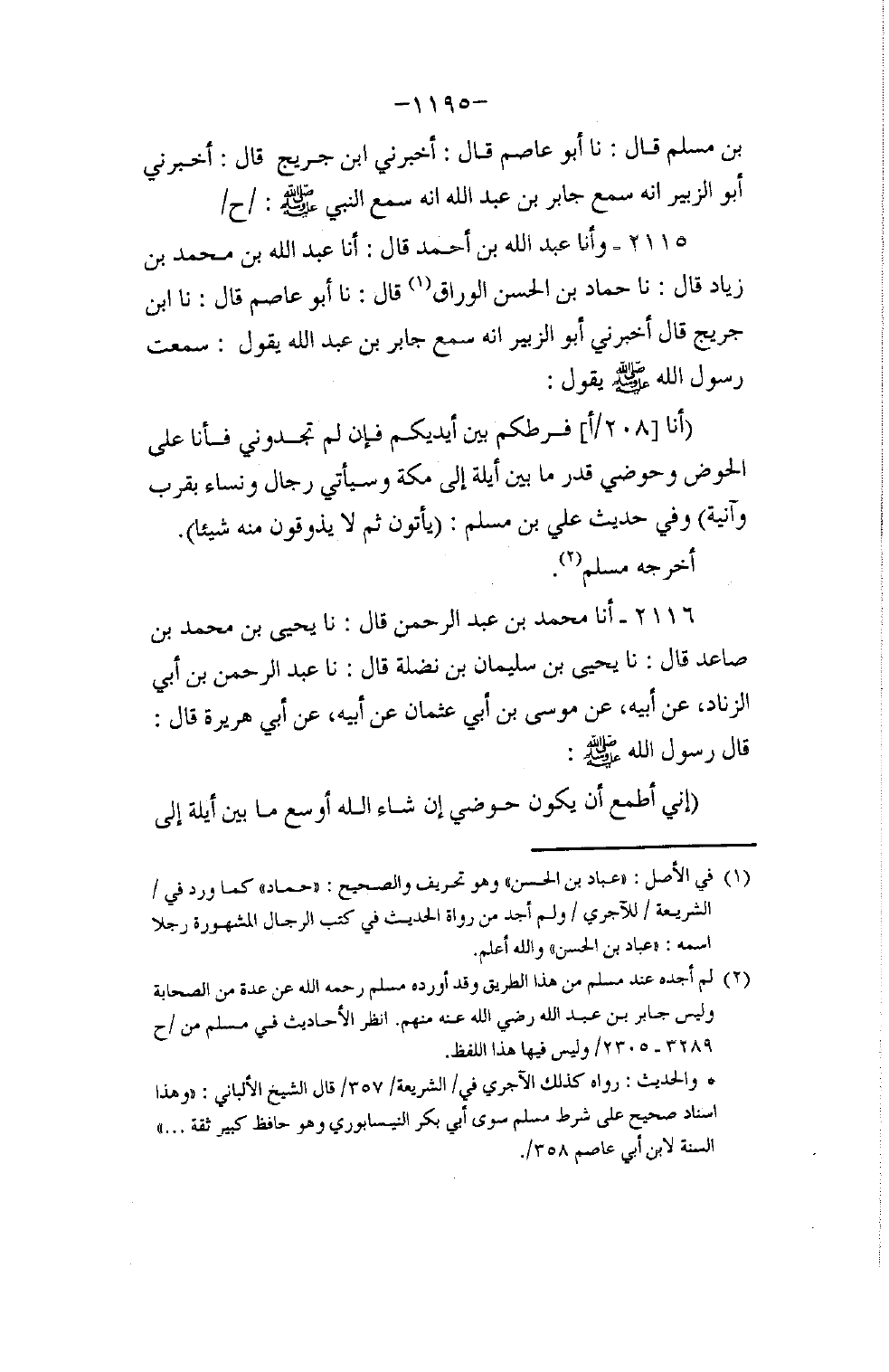 2116 - أنا مُحَمَّدُ بْنُ عَبْدِ الرَّحْمَنِ، قَالَ: نا يَحْيَى بْنُ مُحَمَّدِ بْنِ صَاعِدٍ، قَالَ: نا يَحْيَى بْنُ سُلَيْمَانَ بْنِ نَضْلَةَ، قَالَ: نا عَبْدُ الرَّحْمَنِ بْنُ أَبِي الزِّنَادِ، عَنْ أَبِيهِ، عَنْ مُوسَى بْنِ أَبِي عُثْمَانَ، عَنْ أَبِيهِ، عَنْ أَبِي هُرَيْرَةَ، قَالَ: قَالَ رَسُولُ اللَّهِ صَلَّى اللهُ عَلَيْهِ وَسَلَّمَ: §«إِنِّي أَطْمَعُ أَنْ يَكُونَ حَوْضِي إِنْ شَاءَ اللَّهُ أَوْسَعَ مَا بَيْنَ أَيْلَةَ إِلَى -[1196]- الْكَعْبَةِ، وَإِنَّ فِيهِ مِنَ الْأَبَارِيقِ لَأَكْثَرَ مِنْ عَدَدِ الْكَوَاكِبِ»
