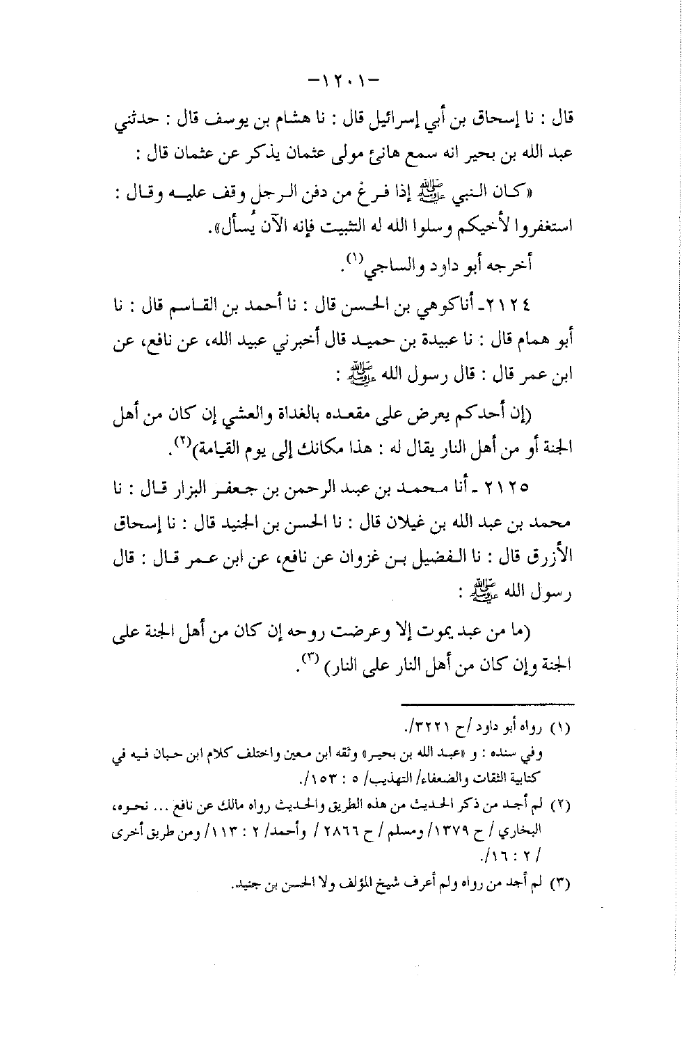 2125 - أنا مُحَمَّدُ بْنُ عَبْدِ الرَّحْمَنِ بْنِ جَعْفَرٍ الْبَزَّارُ، قَالَ: نا مُحَمَّدُ بْنُ عَبْدِ اللَّهِ بْنِ غَيْلَانَ، قَالَ: نا الْحَسَنُ بْنُ الْجُنَيْدِ، قَالَ: نا إِسْحَاقُ الْأَزْرَقُ، قَالَ: نا الْفُضَيْلُ بْنُ غَزْوَانَ، عَنْ نَافِعٍ، عَنِ ابْنِ عُمَرَ، قَالَ: قَالَ رَسُولُ اللَّهِ صَلَّى اللهُ عَلَيْهِ وَسَلَّمَ: §«مَا مِنْ عَبْدٍ يَمُوتُ إِلَّا وَعُرِضَتْ رُوحُهُ إِنْ كَانَ مِنْ أَهْلِ الْجَنَّةِ عَلَى الْجَنَّةِ، وَإِنْ كَانَ مِنْ أَهْلِ النَّارِ عَلَى النَّارِ»