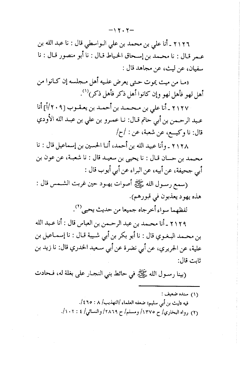 2129 - أنا مُحَمَّدُ بْنُ عَبْدِ الرَّحْمَنِ بْنِ الْعَبَّاسِ، قَالَ: أنا عَبْدُ اللَّهِ بْنُ مُحَمَّدٍ الْبَغَوِيُّ، قَالَ: نا أَبُو بَكْرِ بْنُ أَبِي شَيْبَةَ، قَالَ: نا إِسْمَاعِيلُ بْنُ عُلَيَّةَ، عَنِ الْجُرَيْرِيِّ، عَنْ أَبِي نَضْرَةَ، عَنْ أَبِي سَعِيدٍ الْخُدْرِيِّ، قَالَ: نا زَيْدُ بْنُ ثَابِتٍ، قَالَ: بَيْنَا رَسُولُ اللَّهِ صَلَّى اللهُ عَلَيْهِ وَسَلَّمَ فِي حَائِطِ بَنِي النَّجَّارِ عَلَى بَغْلَةٍ لَهُ فَحَادَتْ -[1203]- بِهِ فَكَادَتْ تَقْلِبُهُ، وَإِذَا قَبْرُ سِتَّةٍ أَوْ خَمْسَةٍ، أَوْ أَرْبَعَةٍ فَقَالَ: «إِنَّ هَذِهِ الْأُمَّةَ لَتُبْتَلَى فِي قُبُورِهَا فَلَوْلَا أَنْ لَا تَدَافَنُوا دَعَوْتُ اللَّهَ أَنْ يُسْمِعَكُمْ مِنْ عَذَابِ الْقَبْرِ الَّذِي أَسْمَعُ مِنْهُ» ثُمَّ قَالَ: «§تَعَوَّذُوا بِاللَّهِ مِنْ عَذَابِ الْقَبْرِ» قُلْنَا: نَعُوذُ بِاللَّهِ مِنْ عَذَابِ الْقَبْرِ، قَالَ: «تَعَوَّذُوا بِاللَّهِ مِنَ الْفِتَنِ» ، قُلْنَا: نَعُوذُ بِاللَّهِ مِنَ الْفِتَنِ مَا ظَهَرَ مِنْهَا وَمَا بَطَنَ، قَالَ: «تَعَوَّذُوا بِاللَّهِ مِنَ الدَّجَّالِ» ، قُلْنَا: نَعُوذُ بِاللَّهِ مِنَ الدَّجَّالِ " أَخْرَجَهُ مُسْلِمٌ عَنْ أَبِي بَكْرِ بْنِ أَبِي شَيْبَةَ