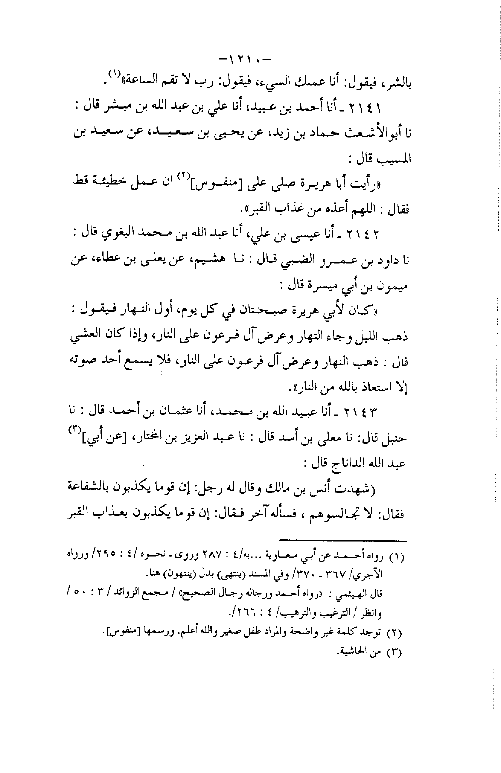 2141 - أنا أَحْمَدُ بْنُ عُبَيْدٍ، أنا عَلِيُّ بْنُ عَبْدِ اللَّهِ بْنِ مُبَشِّرٍ، قَالَ: نا أَبُو الْأَشْعَثِ، قَالَ: نا حَمَّادُ بْنُ زَيْدٍ، عَنْ يَحْيَى بْنِ سَعِيدِ، عَنْ سَعِيدِ بْنِ الْمُسَيِّبِ، قَالَ: " رَأَيْتُ أَبَا هُرَيْرَةَ صَلَّى عَلَى مَنْفُوسٍ إِنْ عَمِلَ، خَطِيئَةً قَطُّ فَقَالَ§: اللَّهُمَّ أَعِذْهُ مِنْ عَذَابِ الْقَبْرِ "