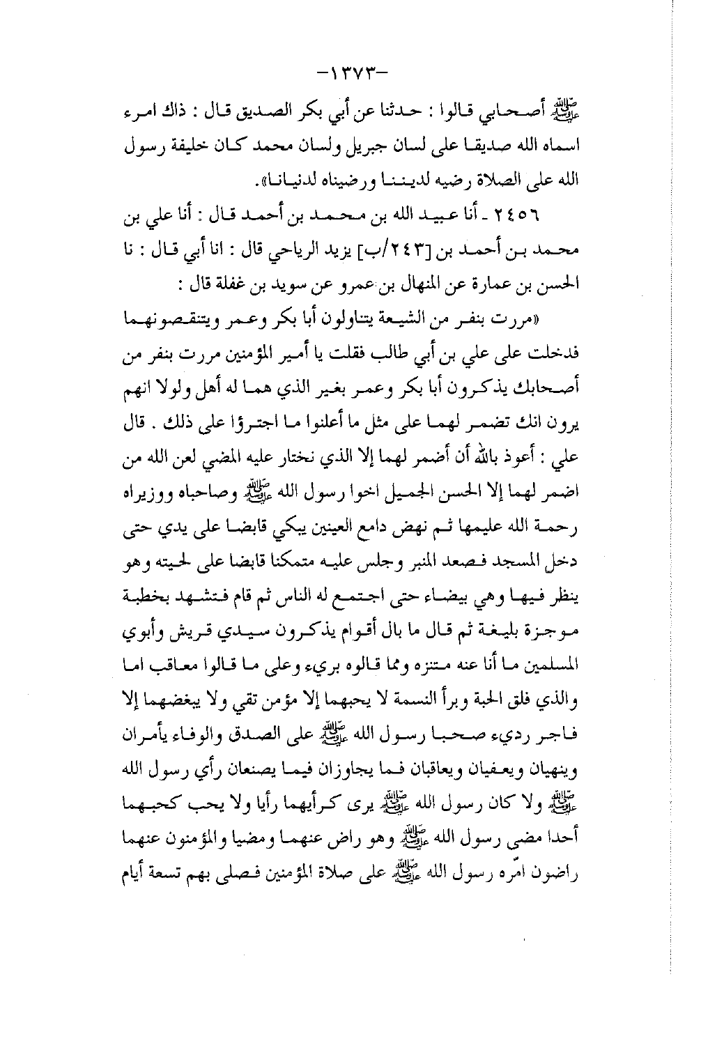 2456 - أنا عُبَيْدُ اللَّهِ بْنُ مُحَمَّدِ بْنِ أَحْمَدَ، قَالَ: أنا عَلِيُّ بْنُ مُحَمَّدِ بْنِ أَحْمَدَ بْنِ يَزِيدَ الرِّيَاحِيُّ، قَالَ: أنا أَبِي قَالَ: نا الْحَسَنُ بْنُ عُمَارَةَ، عَنِ الْمِنْهَالِ بْنِ عَمْرٍو، عَنْ سُوَيْدِ بْنِ غَفَلَةَ، قَالَ: مَرَرْتُ بِنَفَرٍ مِنَ الشِّيعَةِ يَتَنَاوَلُونَ أَبَا بَكْرٍ وَعُمَرَ وَيَنْتَقِصَونَهُمَا، فَدَخَلْتُ عَلَى عَلِيِّ بْنِ أَبِي طَالِبٍ فَقُلْتُ: يَا أَمِيرَ الْمُؤْمِنِينَ، مَرَرْتُ بِنَفَرٍ مِنْ أَصْحَابِكَ يَذْكُرُونَ أَبَا بَكْرٍ وَعُمَرَ بِغَيْرِ الَّذِي هُمَا لَهُ أَهْلٌ، وَلَوْلَا أَنَّهُمْ يَرَوْنَ أَنَّكَ تُضْمِرُ لَهُمَا عَلَى مِثْلِ مَا أَعْلَنُوا مَا اجْتَرَءُوا عَلَى ذَلِكَ. قَالَ عَلِيٌّ: أَعُوذُ بِاللَّهِ أَنْ أُضْمِرَ لَهُمَا إِلَّا الَّذِي نَخْتَارُ عَلَيْهِ الْمُضِيَّ، §لَعَنَ اللَّهُ مَنْ أَضْمَرَ لَهُمَا إِلَّا الْحَسَنَ الْجَمِيلَ، أَخَوَا رَسُولِ اللَّهِ صَلَّى اللهُ عَلَيْهِ وَسَلَّمَ وَصَاحِبَاهُ وَوَزِيرَاهُ، رَحْمَةُ اللَّهِ عَلَيْهِمَا. ثُمَّ نَهَضَ دَامِعَ الْعَيْنَيْنِ يَبْكِي قَابِضًا عَلَى يَدِي حَتَّى دَخَلَ الْمَسْجِدَ، فَصَعِدَ الْمِنْبَرَ، وَجَلَسَ عَلَيْهِ مُتَمَكِّنًا قَابِضًا عَلَى لِحْيَتِهِ، وَهُوَ يَنْظُرُ فِيهَا، وَهِيَ بَيْضَاءُ حَتَّى اجْتَمَعَ لَهُ النَّاسُ، ثُمَّ قَامَ فَتَشَهَّدَ بِخُطْبَةٍ مُوجَزَةٍ بَلِيغَةٍ، ثُمَّ قَالَ: مَا بَالُ أَقْوَامٍ يَذْكُرُونَ سَيِّدَيْ قُرَيْشٍ وَأَبَوَيِ الْمُسْلِمِينَ مَا أَنَا عَنْهُ مُتَنَزِّهٌ، وَمِمَّا قَالُوهُ بَرِيءٌ، وَعَلَى مَا قَالُوا مُعَاقِبٌ , أَمَا وَالَّذِي فَلَقَ الْحَبَّةَ وَبَرَأَ النَّسَمَةَ لَا يُحِبُّهُمَا إِلَّا مُؤْمِنٌ تَقِيٌّ، وَلَا يُبْغِضُهُمَا إِلَّا فَاجِرٌ رَدِيءٌ، صَحِبَا رَسُولَ اللَّهِ صَلَّى اللهُ عَلَيْهِ وَسَلَّمَ عَلَى الصِّدْقِ وَالْوَفَاءِ، يَأْمُرَانِ وَيَنْهَيَانِ، وَيُعْفِيَانِ وَيُعَاقِبَانِ، فَمَا يُجَاوِزَانِ فِيمَا يَصْنَعَانِ رَأْيَ رَسُولِ اللَّهِ صَلَّى اللهُ عَلَيْهِ وَسَلَّمَ، وَلَا كَانَ رَسُولُ اللَّهِ صَلَّى اللهُ عَلَيْهِ وَسَلَّمَ يَرَى كَرَأْيِهِمَا رَأْيًا، وَلَا يُحِبُّ كَحُبِّهِمَا أَحَدًا , مَضَى رَسُولُ اللَّهِ صَلَّى اللهُ عَلَيْهِ وَسَلَّمَ وَهُوَ رَاضٍ عَنْهُمَا، وَمَضَيَا وَالْمُؤْمِنُونَ عَنْهُمَا رَاضُونَ , أَمَّرَهُ رَسُولُ اللَّهِ صَلَّى اللهُ عَلَيْهِ وَسَلَّمَ عَلَى صَلَاةِ الْمُؤْمِنِينَ، فَصَلَّى بِهِمْ تِسْعَةَ أَيَّامٍ -[1374]- فِي حَيَاةِ رَسُولِ اللَّهِ صَلَّى اللهُ عَلَيْهِ وَسَلَّمَ، فَلَمَّا قَبَضَ نَبِيَّهُ، وَاخْتَارَ لَهُ مَا عِنْدَهُ، وَلَّاهُ الْمُؤْمِنُونَ ذَلِكَ، وَفَوَّضُوا إِلَيْهِ الزَّكَاةَ؛ لِأَنَّهُمَا مَقْرُونَتَانِ، ثُمَّ أَعْطَوْهُ الْبَيْعَةَ طَائِعِينَ غَيْرَ مُكْرَهِينَ، أَنَا أَوَّلُ مَنْ سَنَّ لَهُ ذَلِكَ مِنْ بَنِي عَبْدِ الْمُطَّلِبِ، وَهُوَ لِذَلِكَ كَارِهٌ يَوَدُّ أَنَّ أَحَدًا مِنَّا كَفَاهُ ذَلِكَ، وَكَانَ وَاللَّهِ خَيْرَ مَنْ بَقِيَ، أَرْحَمَهُ رَحْمَةً، وَأَرْأَفَهُ رَأْفَةً، وَأَكْيَسَهُ وَرَعًا، وَأَقْدَمَهُ سِنًّا وَإِسْلَامًا، شَبَّهَهُ رَسُولُ اللَّهِ صَلَّى اللهُ عَلَيْهِ وَسَلَّمَ بِمِيكَائِيلَ رَأْفَةً وَرَحْمَةً، وَبِإِبْرَاهِيمَ عَفْوًا وَوَقَارًا، فَسَارَ بِسِيرَةِ رَسُولِ اللَّهِ صَلَّى اللهُ عَلَيْهِ وَسَلَّمَ حَتَّى مَضَى عَلَى ذَلِكَ رَحْمَةُ اللَّهِ عَلَيْهِ، ثُمَّ وَلِيَ الْأَمْرَ مِنْ بَعْدِهِ عُمَرُ، فَاسْتَأْمَرَ الْمُسْلِمِينَ فِي ذَلِكَ، فَمِنْهُمْ مَنْ رَضِيَ، وَمِنْهُمْ مِنْ كَرِهَ، وَكُنْتُ فِيمَنْ رَضِيَ، فَلَمْ يُفَارِقْ عُمَرُ الدُّنْيَا حَتَّى رَضِيَ بِهِ مَنْ كَانَ كَرِهَهُ، ف