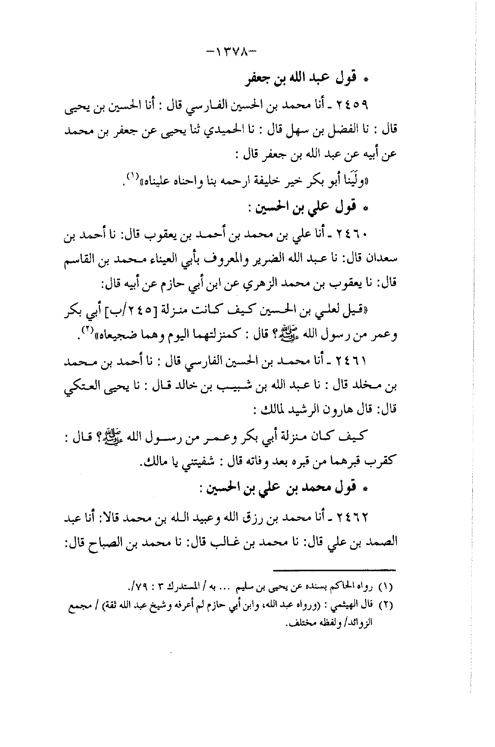 2459 - أنا مُحَمَّدُ بْنُ الْحُسَيْنِ الْفَارِسِيُّ، قَالَ: أنا الْحُسَيْنُ بْنُ يَحْيَى، قَالَ: نا الْفَضْلُ بْنُ سَهْلٍ، قَالَ: نا الْحُمَيْدِيُّ، ثنا يَحْيَى، عَنْ جَعْفَرِ بْنِ مُحَمَّدٍ، عَنْ أَبِيهِ، عَنْ عَبْدِ اللَّهِ بْنِ جَعْفَرٍ، قَالَ: §وَلِيَنَا أَبُو بَكْرٍ، خَيْرُ خَلِيفَةٍ، أَرْحَمُهُ بِنَا، وَأَحْنَاهُ عَلَيْنَا