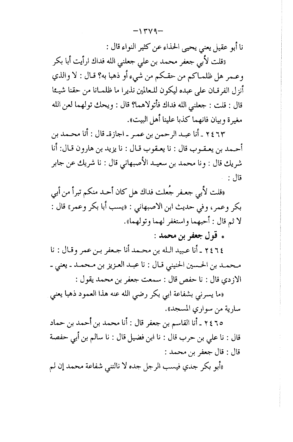 2465 - أنا الْقَاسِمُ بْنُ جَعْفَرٍ، قَالَ: أنا مُحَمَّدُ بْنُ أَحْمَدَ بْنِ حَمَّادٍ، قَالَ: نا عَلِيُّ بْنُ حَرْبٍ، قَالَ: نا ابْنُ فُضَيْلٍ، قَالَ: نا سَالِمُ بْنُ أَبِي حَفْصَةَ، قَالَ: قَالَ جَعْفَرُ بْنُ مُحَمَّدٍ: §أَبُو بَكْرٍ جَدِّي، فَيَسُبُّ الرَّجُلُ جَدَّهُ؟ لَا نَالَتْنِي شَفَاعَةُ مُحَمَّدٍ إِنْ لَمْ -[1380]- أَكُنْ أَتَوَلَّاهُمَا، وَأَبْرَأُ مِنْ عَدُوِّهِمَا