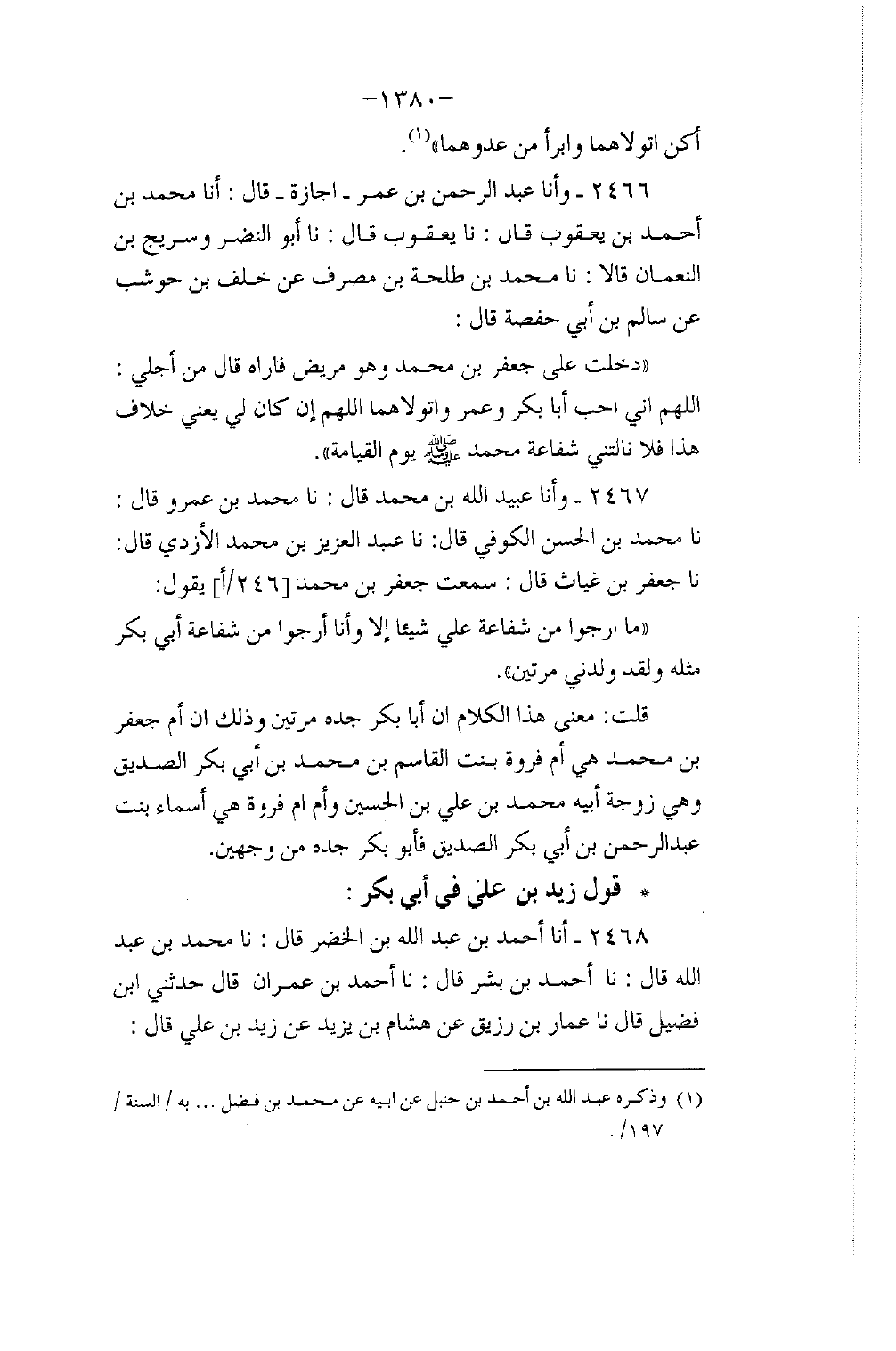 2466 - وأنا عَبْدُ الرَّحْمَنِ بْنُ عُمَرَ إِجَازَةً، قَالَ: أنا مُحَمَّدُ بْنُ أَحْمَدَ بْنِ يَعْقُوبَ، قَالَ: نا يَعْقُوبُ، قَالَ: نا أَبُو النَّضْرِ، وَسُرَيْجُ بْنُ النُّعْمَانِ، قَالَا: نا مُحَمَّدُ بْنُ طَلْحَةَ بْنِ مُصَرِّفٍ، عَنْ خَلَفِ بْنِ حَوْشَبٍ، عَنْ سَالِمِ بْنِ أَبِي حَفْصَةَ، قَالَ: دَخَلْتُ عَلَى جَعْفَرِ بْنِ مُحَمَّدٍ وَهُوَ مَرِيضٌ فَأُرَاهُ قَالَ مِنْ أَجْلِي: §اللَّهُمَّ إِنِّي أُحِبُّ أَبَا بَكْرٍ وَعُمَرَ وَأَتَوَلَّاهُمَا , اللَّهُمَّ إِنْ كَانَ لِي، يَعْنِي خِلَافَ هَذَا، فَلَا نَالَتْنِي شَفَاعَةُ مُحَمَّدٍ صَلَّى اللهُ عَلَيْهِ وَسَلَّمَ يَوْمَ الْقِيَامَةِ
