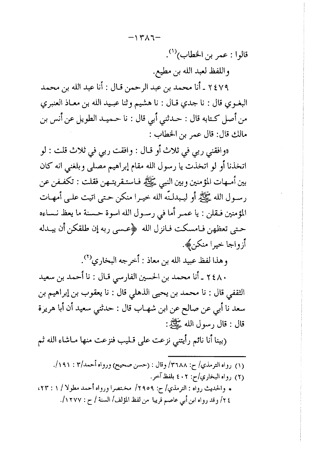 2479 - أنا مُحَمَّدُ بْنُ عَبْدِ الرَّحْمَنِ، قَالَ: أنا عَبْدُ اللَّهِ بْنُ مُحَمَّدٍ الْبَغَوِيُّ، قَالَ: نا جَدِّي، قَالَ: نا هُشَيْمٌ، وَثنا عُبَيْدُ اللَّهِ بْنُ مُعَاذٍ الْعَنْبَرِيُّ مِنْ أَصْلِ كِتَابِهِ قَالَ: حَدَّثَنِي أَبِي قَالَ: نا حُمَيْدٌ الطَّوِيلُ، عَنْ أَنَسِ بْنِ مَالِكٍ، قَالَ: قَالَ عُمَرُ بْنُ الْخَطَّابِ: وَافَقَنِي رَبِّي فِي ثَلَاثٍ، أَوْ قَالَ: §وَافَقْتُ رَبِّي فِي ثَلَاثٍ، قُلْتُ: لَوِ اتَّخَذْنَا، أَوْ لَوِ اتَّخَذْتَ يَا رَسُولَ اللَّهِ مَقَامَ إِبْرَاهِيمَ مُصَلًّى، وَبَلَغَنِي أَنَّهُ كَانَ بَيْنَ أُمَّهَاتِ الْمُؤْمِنِينَ وَبَيْنَ النَّبِيِّ صَلَّى اللهُ عَلَيْهِ وَسَلَّمَ، فَاسْتَقْرَيْتُهُنَّ فَقُلْتُ: تَكْفُفْنَ عَنْ رَسُولِ اللَّهِ صَلَّى اللهُ عَلَيْهِ وَسَلَّمَ أَوْ لَيُبْدِلَنَّهُ اللَّهُ خَيْرًا مِنْكُنَّ، حَتَّى أَتَيْتُ عَلَى أُمَّهَاتِ الْمُؤْمِنِينَ، فَقُلْنَ: يَا عُمَرُ، أَمَا فِي رَسُولِ اللَّهِ أُسْوَةٌ حَسَنَةٌ مَا يَعِظُ نِسَاءَهُ حَتَّى تَعِظَهُنَّ؟ فَأَمْسَكْتُ، فَأَنْزَلَ اللَّهُ: {عَسَى رَبُّهُ إِنْ طَلَّقَكُنَّ أَنْ يُبْدِلَهُ أَزْوَاجًا خَيْرًا مِنْكُنَّ} [التحريم: 5] وَهَذَا لَفْظُ عُبَيْدِ اللَّهِ بْنِ مُعَاذٍ. أَخْرَجَهُ الْبُخَارِيُّ