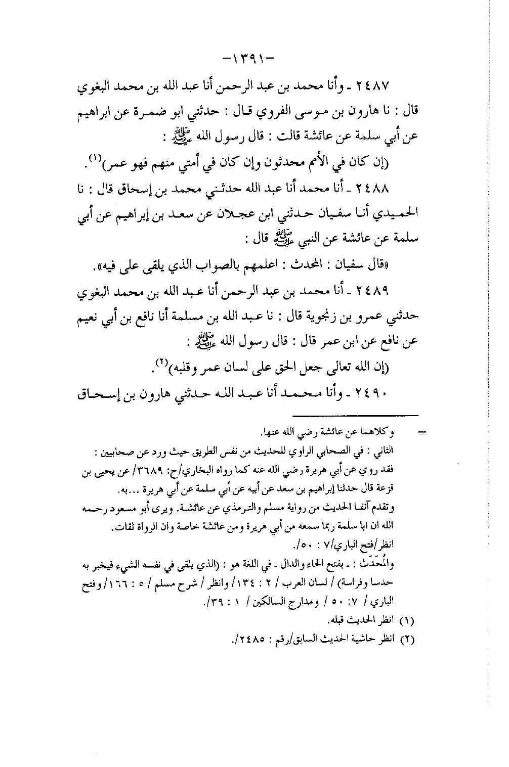 2488 - أنا مُحَمَّدٌ، أنا عَبْدُ اللَّهِ، حَدَّثَنِي مُحَمَّدُ بْنُ إِسْحَاقَ، قَالَ: نا الْحُمَيْدِيُّ، أنا سُفْيَانُ، حَدَّثَنِي ابْنُ عَجْلَانَ، عَنْ سَعْدِ بْنِ إِبْرَاهِيمَ، عَنْ أَبِي سَلَمَةَ، عَنْ عَائِشَةَ، عَنِ النَّبِيِّ صَلَّى اللهُ عَلَيْهِ وَسَلَّمَ قَالَ، مِثْلَهُ. قَالَ سُفْيَانُ: «الْمُحَدَّثُ أَعْلَمُهُمْ بِالصَّوَابِ الَّذِي يُلْقَى عَلَى فِيهِ»