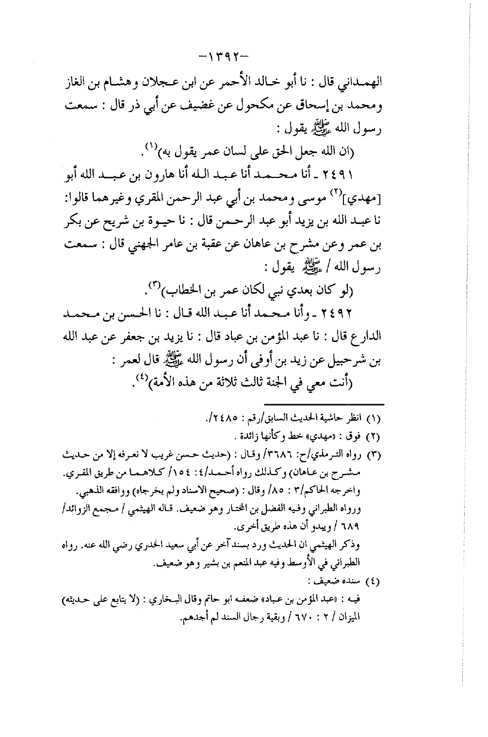 2491 - أنا مُحَمَّدٌ، أنا عَبْدُ اللَّهِ، أنا هَارُونُ بْنُ عَبْدِ اللَّهِ أَبُو مَهْدِيٍّ مُوسَى، وَمُحَمَّدُ بْنُ أَبِي عَبْدِ الرَّحْمَنِ الْمُقْرِي وَغَيْرُهُمَا قَالُوا: نا عَبْدُ اللَّهِ بْنُ يَزِيدَ أَبُو عَبْدِ الرَّحْمَنِ، قَالَ: نا حَيْوَةُ بْنُ شُرَيْحٍ، عَنْ بَكْرِ بْنِ عُمَرَ، وَعَنْ مِشْرَحِ بْنِ عَاهَانَ، عَنْ عُقْبَةَ بْنِ عَامِرٍ الْجُهَنِيِّ، قَالَ: سَمِعْتُ رَسُولَ اللَّهِ صَلَّى اللهُ عَلَيْهِ وَسَلَّمَ يَقُولُ: §«لَوْ كَانَ بَعْدِي نَبِيٌّ لَكَانَ عُمَرَ بْنَ الْخَطَّابِ»