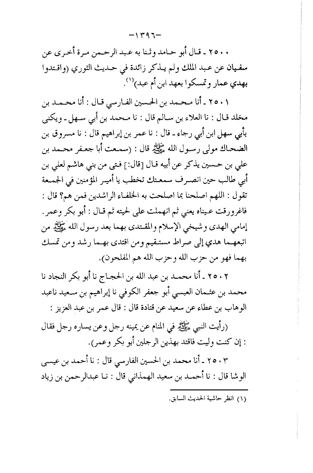 2501 - أنا مُحَمَّدُ بْنُ الْحُسَيْنِ الْفَارِسِيُّ، قَالَ: أنا مُحَمَّدُ بْنُ مَخْلَدٍ، قَالَ: نا الْعَلَاءُ بْنُ سَالِمٍ، قَالَ: نا مُحَمَّدُ بْنُ أَبِي سَهْلٍ وَيُكْنَى بِأَبِي سَهْلِ بْنِ أَبِي رَجَاءٍ قَالَ: نا عُمَرُ بْنُ إِبْرَاهِيمَ، قَالَ: نا مَسْرُوقُ بْنُ الضَّحَّاكِ مَوْلَى رَسُولِ اللَّهِ صَلَّى اللهُ عَلَيْهِ وَسَلَّمَ قَالَ: سَمِعْتُ أَبَا جَعْفَرٍ مُحَمَّدَ بْنَ عَلِيِّ بْنِ حُسَيْنٍ يَذْكُرُ عَنْ أَبِيهِ: قَالَ فَتًى مِنْ بَنِي هَاشِمٍ لِعَلِيِّ بْنِ أَبِي طَالِبٍ حِينَ انْصَرَفَ: " سَمِعْتُكَ تَخْطُبُ يَا أَمِيرَ الْمُؤْمِنِينَ فِي الْجُمُعَةِ، تَقُولُ: «اللَّهُمَّ أَصْلِحْنَا بِمَا أَصْلَحْتَ بِهِ الْخُلَفَاءَ الرَّاشِدِينَ» ، فَمَنْ هُمْ؟ " قَالَ: فَاغْرَوْرَقَتْ عَيْنَاهُ، يَعْنِي ثُمَّ انْهَمَلَتْ عَلَى لِحْيَتِهِ، ثُمَّ قَالَ: «§أَبُو بَكْرٍ وَعُمَرُ، إِمَامَا الْهُدَى، وَشَيْخَا الْإِسْلَامِ، وَالْمُقْتَدَى بِهِمَا بَعْدَ رَسُولِ اللَّهِ صَلَّى اللهُ عَلَيْهِ وَسَلَّمَ، مَنِ اتَّبَعَهُمَا هُدِيَ إِلَى صِرَاطٍ مُسْتَقِيمٍ، وَمَنِ اقْتَدَى بِهِمَا رَشَدَ، وَمَنْ تَمَسَّكَ بِهِمَا فَهُوَ مِنْ حِزْبِ اللَّهِ، وَحِزْبُ اللَّهِ هُمُ الْمُفْلِحُونَ»