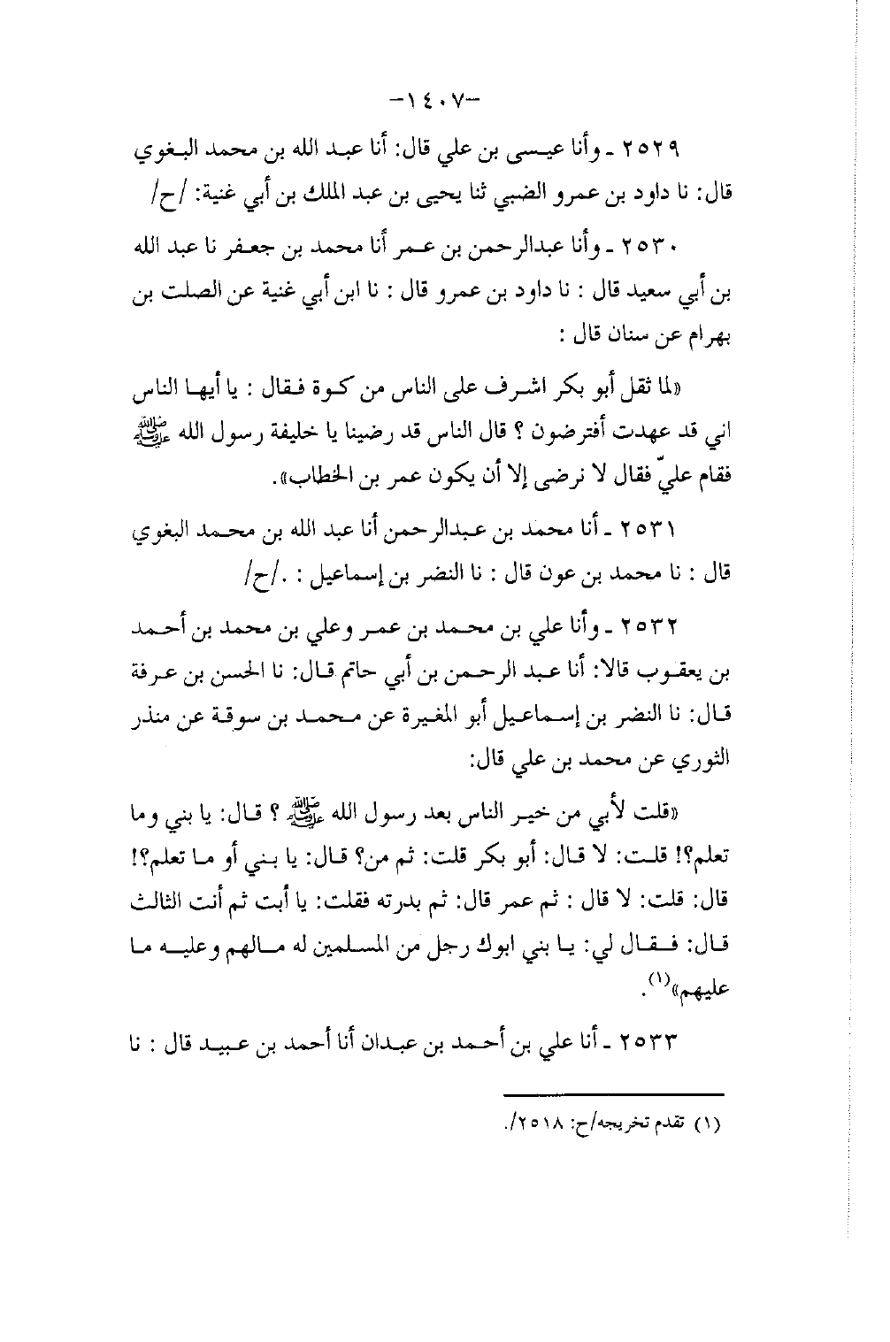 2531 - أنا مُحَمَّدُ بْنُ عَبْدِ الرَّحْمَنِ، أنا عَبْدُ اللَّهِ بْنُ مُحَمَّدٍ الْبَغَوِيُّ، قَالَ: نا مُحَمَّدُ بْنُ عَوْنٍ، قَالَ: نا النَّضْرُ بْنُ إِسْمَاعِيلَ ح