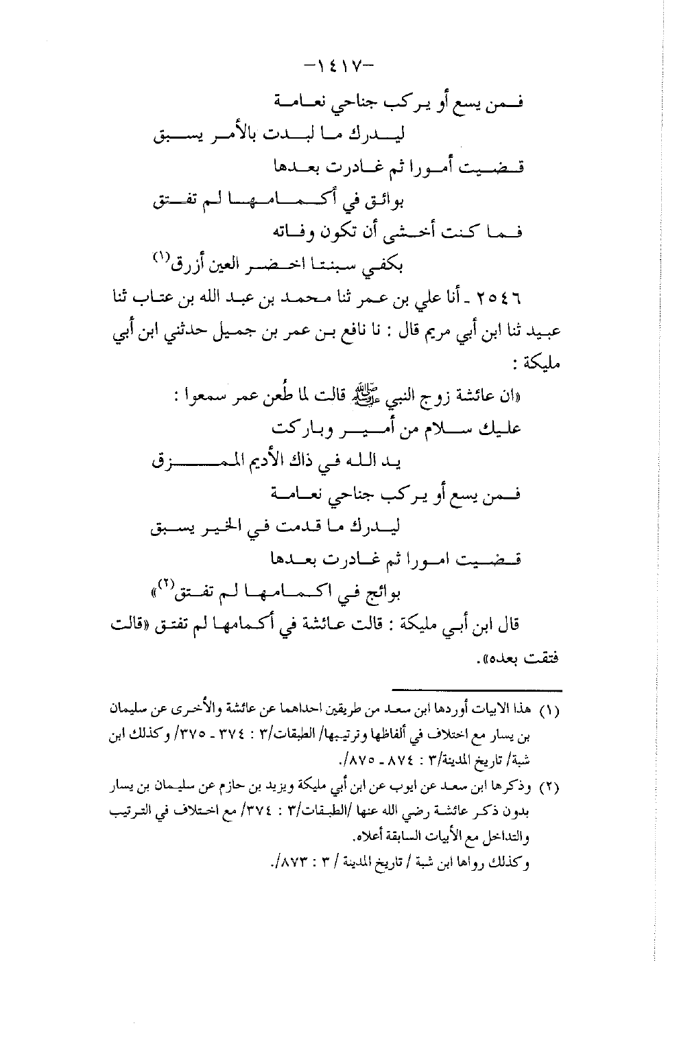 2546 - أنا عَلِيُّ بْنُ عُمَرَ، ثنا مُحَمَّدُ بْنُ عَبْدِ اللَّهِ بْنِ عَتَّابٍ، ثنا عُبَيْدٌ، ثنا ابْنُ أَبِي مَرْيَمَ، قَالَ: نا نَافِعُ بْنُ عُمَرَ بْنِ جَمِيلٍ، حَدَّثَنِي ابْنُ أَبِي مُلَيْكَةَ أَنَّ عَائِشَةَ زَوْجَ النَّبِيِّ صَلَّى اللهُ عَلَيْهِ وَسَلَّمَ قَالَتْ: لَمَّا طُعِنَ عُمَرُ سَمِعُوا: