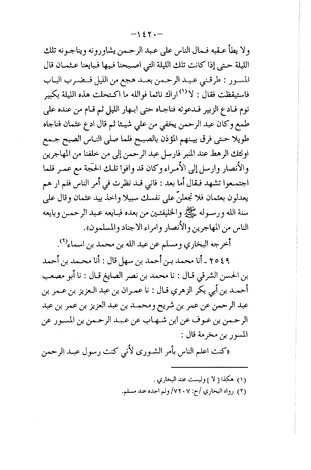 2549 - أنا مُحَمَّدُ بْنُ أَحْمَدَ بْنِ سَهْلٍ، قَالَ: أنا مُحَمَّدُ بْنُ أَحْمَدَ بْنِ الْحَسَنِ الشَّرْقِيُّ، قَالَ: نا مُحَمَّدُ بْنُ نَصْرٍ الصَّايِغُ، قَالَ: نا أَبُو مُصْعَبٍ أَحْمَدُ بْنُ أَبِي بَكْرٍ الزُّهْرِيُّ، قَالَ: نا عِمْرَانُ بْنُ عَبْدِ الْعَزِيزِ بْنِ عُمَرَ بْنِ عَبْدِ الرَّحْمَنِ، عَنْ عُمَرَ بْنِ شُرَيْحٍ، وَمُحَمَّدِ بْنِ عَبْدِ الْعَزِيزِ بْنِ عُمَيْرِ بْنِ عَبْدِ الرَّحْمَنِ بْنِ عَوْفٍ، عَنِ ابْنِ شِهَابٍ، عَنْ عَبْدِ الرَّحْمَنِ بْنِ الْمِسْوَرِ، عَنِ الْمِسْوَرِ بْنِ مَخْرَمَةَ قَالَ: " كُنْتُ أَعْلَمَ النَّاسِ بِأَمْرِ الشُّورَى؛ لِأَنِّي كُنْتُ رَسُولَ عَبْدِ الرَّحْمَنِ -[1421]- بْنِ عَوْفٍ، فَلَمَّا كَانَتْ لَيْلَةُ الثَّالِثَةِ، وَعَبْدُ الرَّحْمَنِ فِي دَارِ الْقَضَاءِ، قَدْ جَاءَتِ الْأَنْصَارُ مِنْ دُورِهَا، فَالْمَسْجِدُ. . . يَنْظُرُونَ مَا كَانَ فِي صَبَاحِ ذَلِكَ الْيَوْمِ، فَكَلَّمَهُ سَعْدٌ، فَقَالَ: «يَا أَبَا مُحَمَّدٍ مَا كَانَ أَحَقُّ بِهَذَا الْأَمْرِ مِنْكَ» . قَالَ: " إِنَّكَ يَا سَعْدُ تُحِبُّ أَنْ يُقَالَ: ابْنُ عَمِّهِ خَلِيفَةٌ، وَإِنَّكَ يَا مِسْوَرُ تُحِبُّ أَنْ يُقَالَ: خَالُهُ خَلِيفَةٌ، وَاللَّهِ لَأَنْ تُؤْخَذَ مُدْيَةٌ، فَأَشَارَ إِلَى لَبَّتِهِ، فَتُوضَعَ هَاهُنَا، وَمَرَّ بِيَدِهِ إِلَى لَبَّتِهِ أَحَبُّ إِلَيَّ مِنْ أَنْ أَلِيَ مِنْ أَمْرِ النَّاسِ شَيْئًا ". فَقَامَ سَعْدٌ إِلَى بَيْتِهِ، فَقَالَ: «يَا أَبَا إِسْحَاقَ، اشْهَدِ الصُّبْحَ، وَالْبَسِ السَّيْفَ» . قَالَ: وَدَعَانِي عَبْدُ الرَّحْمَنِ، وَقَالَ: «اذْهَبْ إِلَى عَلِيٍّ وَعُثْمَانَ فَائْتِنِي بِهِمَا» . قَالَ: وَكَانَ هَوَايَ فِي عَلِيٍّ فَأَحْبَبْتُ أَنْ أَعْلَمَ مَا فِي نَفْسِهِ، فَقُلْتُ: بِأَيِّهِمَا أَبْدَأُ؟ قَالَ: «بِأَيِّهِمَا شِئْتَ» . قَالَ: فَقُلْتُ: آتِيكَ بِهِمَا جَمِيعًا أَوْ فُرَادَى؟ قَالَ: «لَا بَلْ جَمِيعًا» . قَالَ عَبْدَانُ لِعَلِيٍّ: فَكَانَ هَوَايَ فِيهِ، فَقُلْتُ: أَرْسَلَنِي إِلَيْكَ خَالِي، قَالَ: «أَرْسَلَكَ مَعِي إِلَى غَيْرِي؟» فَقُلْتُ: نَعَمْ إِلَى عُثْمَانَ. قَالَ: «بِأَيِّنَا أَمَرَكَ أَنْ تَبْدَأَ» ؟ قُلْتُ: قَدْ سَأَلْتُهُ، قَالَ: بِأَيِّهِمَا شِئْتَ، فَبَدَأْتُ بِكَ. فَقَالَ: «جَمِيعًا أَوْ فُرَادَى؟» . قَالَ: لَا، بَلْ جَمِيعًا. قَالَ: فَقَعَدَ عَلِيٌّ عَلَى مَوْضِعِ الْجَنَائِزِ، وَقَالَ: «اذْهَبْ إِلَى صَاحِبِكَ» . قَالَ: فَخَرَجْتُ إِلَى عُثْمَانَ فَوَجَدْتُهُ يُوتِرُ فِي بَيْتِ شَيْبَةَ بْنِ رَبِيعَةَ، فَخَرَجَ إِلَيَّ عُثْمَانُ عَاقِدًا إِزَارَهُ فِي عُنُقِهِ فِي آخِرِ اللَّيْلِ، فَقُلْتُ: إِنَّ خَالِي أَرْسَلَنِي إِلَيْكَ، فَقَالَ: هَلْ أَرْسَلَكَ مَعِي إِلَى غَيْرِي؟ قُلْتُ: نَعَمْ، إِلَى عَلِيٍّ، فَسَأَلْتُهُ بِأَيِّهِمَا أَبْدَأُ، فَقَالَ: بِأَيِّهِمَا شِئْتَ، وَقَدْ بَدَأْتُ بِعَلِيٍّ، وَهُوَ يَنْتَظِرُكَ فِي مَوْضِعِ الْجَنَائِزِ، فَخَرَجْتُ أَنَا وَعُثْمَانُ حَتَّى جِئْنَا عَلِيًّا، ثُمَّ خَرَجْنَا ثَلَاثَتُنَا حَتَّى جِئْنَا عَبْدَ الرَّحْمَنِ فِي مَجْلِسِهِ. قَالَ: وَكَانَ عَبْدُ الرَّحْمَنِ لَا يَتَكَلَّفُ الْكَلَامَ وَلَا الْخُطَبَ، قَالَ: فَمَا رَأَيْتُهُ خَطَبَ قَبْلَ تِلْكَ اللَّيْلَةِ، قَالَ: فَحَمِدَ اللَّهَ وَأَثْنَى عَلَيْهِ، ثُمَّ قَالَ فِي قَوْلِهِ: «§إِنِّي قَلَّبْتُ النَّاسَ عَنْكُمَا فَأَشِيرَا عَلَيَّ، وَأَعِينَانِي عَلَى أَنْفُسِكُمَا، هَلْ -[1422]- أَنْتَ يَا عَلِيُّ مُبَايِعِي عَلَى سُنَّةِ اللَّهِ وَرَسُولِهِ، وَبِعَهْدِ اللَّهِ وَمِيثَاقِهِ، وَسُنَّةِ الْمَاضِيَيْنِ قَبْلُ؟» قَالَ: «لَا، وَلَكِنْ أُبَايِعُكَ عَلَى طَاقَتِي» . قَالَ: فَصَمَتَ شَيْئًا ثُمَّ تَكَلَّمَ مَا دُونَ الْكَلَامِ الْأَو