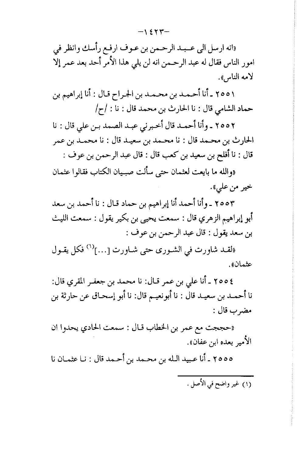 2554 - أنا عَلِيُّ بْنُ عُمَرَ، قَالَ: نا مُحَمَّدُ بْنُ جَعْفَرٍ الْمُقْرِي، قَالَ: نا أَحْمَدُ بْنُ سَعِيدٍ، قَالَ: نا أَبُو نُعَيْمٍ، قَالَ: نا أَبُو إِسْحَاقَ، عَنْ حَارِثَةَ بْنِ مُضَرِّبٍ، قَالَ: حَجَجْتُ مَعَ عُمَرَ بْنِ الْخَطَّابِ، قَالَ: §سَمِعْتُ الْحَادِيَ يَحْدُو: إِنَّ الْأَمِيرَ بَعْدَهُ ابْنُ عَفَّانَ