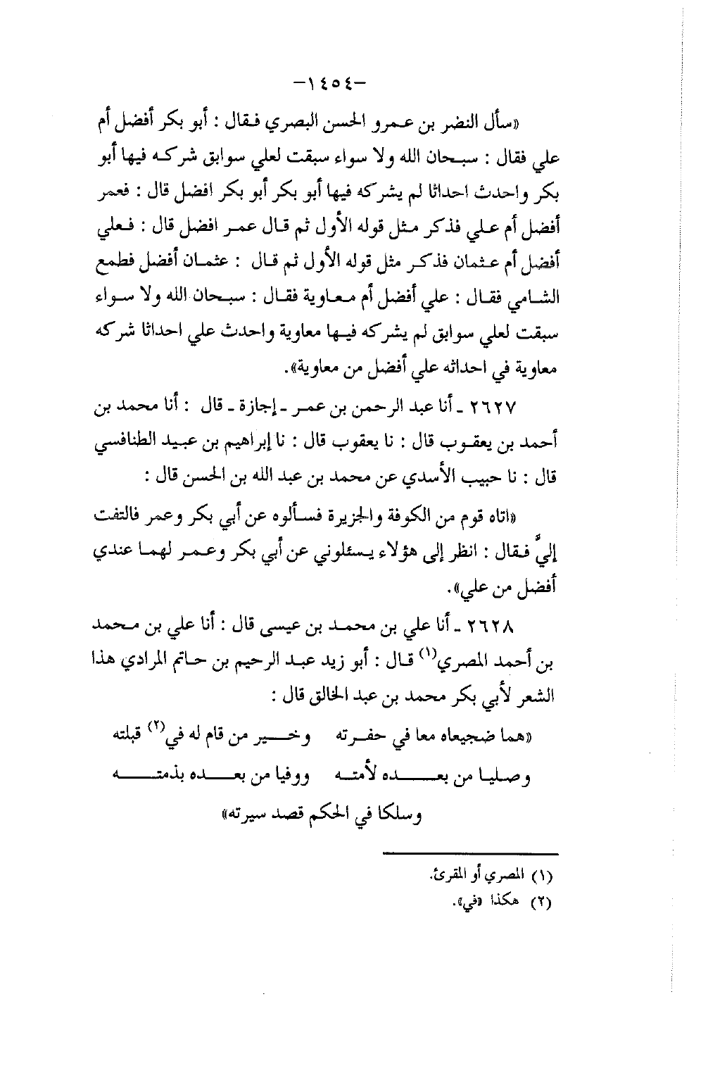 2628 - أنا عَلِيُّ بْنُ مُحَمَّدِ بْنِ عِيسَى، قَالَ: أنا عَلِيُّ بْنُ مُحَمَّدِ بْنِ أَحْمَدَ الْمِصْرِيُّ، قَالَ أَبُو زَيْدٍ عَبْدُ الرَّحِيمِ بْنُ حَاتِمٍ الْمُرَادِيُّ هَذَا الشِّعْرَ لِأَبِي بَكْرٍ مُحَمَّدِ بْنِ عَبْدِ الْخَالِقِ قَالَ:
