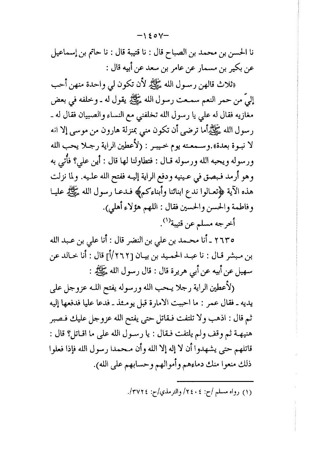 2635 - أنا مُحَمَّدُ بْنُ عَلِيِّ بْنِ النَّضْرِ، قَالَ: أنا عَلِيُّ بْنُ عَبْدِ اللَّهِ بْنِ مُبَشِّرٍ، قَالَ: نا عَبْدُ الْحَمِيدِ بْنُ بَيَانٍ، قَالَ: أنا خَالِدٌ، عَنْ سُهَيْلٍ، عَنْ أَبِيهِ، عَنْ أَبِي هُرَيْرَةَ، قَالَ: قَالَ رَسُولُ اللَّهِ صَلَّى اللهُ عَلَيْهِ وَسَلَّمَ: " §لَأُعْطِيَنَّ الرَّايَةَ رَجُلًا يُحِبُّ اللَّهَ وَرَسُولَهُ، يَفْتَحُ اللَّهُ عَزَّ وَجَلَّ عَلَى يَدَيْهِ. فَقَالَ عُمَرُ: مَا أَحْبَبْتُ الْإِمَارَةَ قَبْلَ يَوْمِئِذٍ. فَدَعَا عَلِيًّا فَدَفَعَهَا إِلَيْهِ، ثُمَّ قَالَ: اذْهَبْ وَلَا تَلْتَفِتْ، فَقَاتِلْ حَتَّى يَفْتَحَ اللَّهُ عَزَّ وَجَلَّ عَلَيْكَ، فَصَبَرَ هُنَيْهَةً، ثُمَّ وَقَفَ وَلَمْ يَلْتَفِتْ، فَقَالَ: يَا رَسُولَ اللَّهِ عَلَى مَا أُقَاتِلُ؟ قَالَ: قَاتِلْهُمْ حَتَّى يَشْهَدُوا أَنْ لَا إِلَهَ إِلَّا اللَّهُ، وَأَنَّ مُحَمَّدًا رَسُولُ اللَّهِ، فَإِذَا فَعَلُوا ذَلِكَ مَنَعُوا مِنْكَ دِمَاءَهُمْ وَأَمْوَالَهُمْ، وَحِسَابُهُمْ عَلَى اللَّهِ " -[1458]- أَخْرَجَهُ مُسْلِمٌ