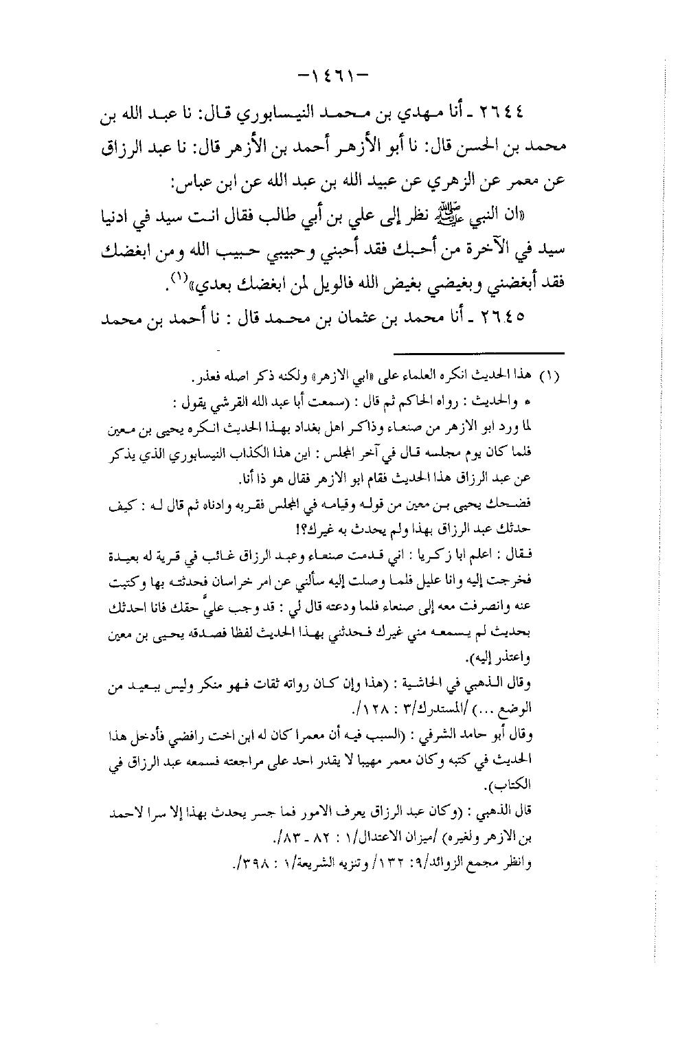 2644 - أنا مَهْدِيُّ بْنُ مُحَمَّدٍ النَّيْسَابُورِيُّ، قَالَ: نا عَبْدُ اللَّهِ بْنُ مُحَمَّدِ بْنِ الْحَسَنِ، قَالَ: نا أَبُو الْأَزْهَرِ أَحْمَدُ بْنُ الْأَزْهَرِ قَالَ: نا عَبْدُ الرَّزَّاقِ، عَنْ مَعْمَرٍ، عَنِ الزُّهْرِيِّ، عَنْ عُبَيْدِ اللَّهِ بْنِ عَبْدِ اللَّهِ، عَنِ ابْنِ عَبَّاسٍ أَنَّ النَّبِيَّ صَلَّى اللهُ عَلَيْهِ وَسَلَّمَ نَظَرَ إِلَى عَلِيِّ بْنِ أَبِي طَالِبٍ، فَقَالَ: «§أَنْتَ سَيِّدٌ فِي الدُّنْيَا، سَيِّدٌ فِي الْآخِرَةِ، مَنْ أَحَبَّكَ فَقَدْ أَحَبَّنِي، وَحَبِيبِي حَبِيبُ اللَّهِ، وَمَنْ أَبْغَضَكَ فَقَدْ أَبْغَضَنِي، وَبَغِيضِي بَغِيضُ اللَّهِ، فَالْوَيْلُ لِمَنْ أَبْغَضَكَ بَعْدِي»