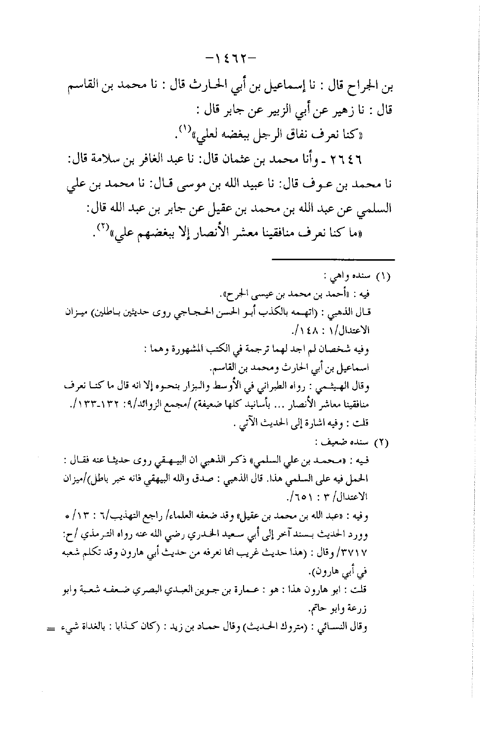 2646 - وَأنا مُحَمَّدُ بْنُ عُثْمَانَ، قَالَ: نا عَبْدُ الْغَافِرِ بْنُ سَلَامَةَ، قَالَ: نا مُحَمَّدُ بْنُ عَوْفٍ، قَالَ: نا عُبَيْدُ اللَّهِ بْنُ مُوسَى، قَالَ: نا مُحَمَّدُ بْنُ عَلِيٍّ السُّلَمِيُّ، عَنْ عَبْدِ اللَّهِ بْنِ مُحَمَّدِ بْنِ عَقِيلٍ، عَنْ جَابِرِ بْنِ عَبْدِ اللَّهِ، قَالَ: §مَا كُنَّا نَعْرِفُ مُنَافِقِينَا مَعْشَرَ الْأَنْصَارِ إِلَّا بِبُغْضِهِمْ عَلِيًّا