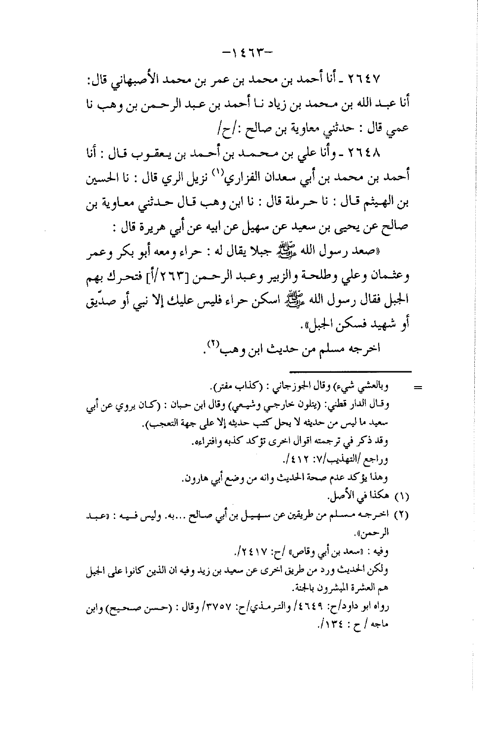 2648 - وَأنا عَلِيُّ بْنُ مُحَمَّدِ بْنِ أَحْمَدَ بْنِ يَعْقُوبَ، قَالَ: أنا أَحْمَدُ بْنُ مُحَمَّدِ بْنِ أَبِي سَعْدَانَ الْفَزَارِيُّ نَزِيلُ الرَّيِّ، قَالَ: نا الْحُسَيْنُ بْنُ الْهَيْثَمِ، قَالَ: نا حَرْمَلَةُ، قَالَ: نا ابْنُ وَهْبٍ، قَالَ: حَدَّثَنِي مُعَاوِيَةُ بْنُ صَالِحٍ، عَنْ يَحْيَى بْنِ سَعِيدٍ، عَنْ سُهَيْلٍ، عَنْ أَبِيهِ، عَنْ أَبِي هُرَيْرَةَ، قَالَ: صَعِدَ رَسُولُ اللَّهِ صَلَّى اللهُ عَلَيْهِ وَسَلَّمَ جَبَلًا يُقَالُ لَهُ حِرَاءٌ، وَمَعَهُ أَبُو بَكْرٍ وَعُمَرُ وَعُثْمَانُ وَعَلِيٌّ وَطَلْحَةُ وَالزُّبَيْرُ وَعَبْدُ الرَّحْمَنِ، فَتَحَرَّكَ بِهِمُ الْجَبَلُ، فَقَالَ رَسُولُ اللَّهِ صَلَّى اللهُ عَلَيْهِ وَسَلَّمَ: «§اسْكُنْ حِرَاءُ، فَلَيْسَ عَلَيْكَ إِلَّا نَبِيٌّ، أَوْ صِدِّيقٌ، أَوْ شَهِيدٌ» . فَسَكَنَ الْجَبَلُ أَخْرَجَهُ مُسْلِمٌ مِنْ حَدِيثِ ابْنِ وَهْبٍ