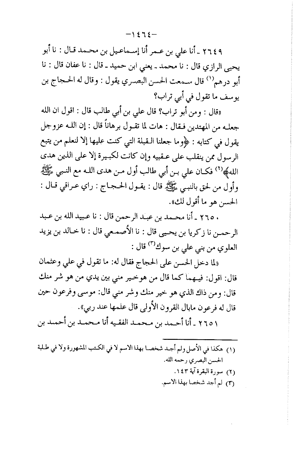 2649 - أنا عَلِيُّ بْنُ عُمَرَ، أنا إِسْمَاعِيلُ بْنُ مُحَمَّدٍ، قَالَ: نا أَبُو يَحْيَى الرَّازِيُّ، قَالَ: نا مُحَمَّدٌ، يَعْنِي ابْنَ حُمَيْدٍ، قَالَ: نا عَفَّانُ، قَالَ: نا أَبُو دِرْهَمٍ، قَالَ: سَمِعْتُ الْحَسَنَ الْبَصْرِيَّ يَقُولُ، وَقَالَ لَهُ الْحَجَّاجُ بْنُ يُوسُفَ: مَا تَقُولُ فِي أَبِي تُرَابٍ؟ قَالَ: وَمَنْ أَبُو تُرَابٍ؟ قَالَ عَلِيُّ بْنُ أَبِي طَالِبٍ. قَالَ: أَقُولُ: إِنَّ اللَّهَ جَعَلَهُ مِنَ الْمُهْتَدِينَ. فَقَالَ: هَاتِ مَا تَقُولُ بُرْهَانًا. قَالَ: إِنَّ اللَّهَ عَزَّ وَجَلَّ يَقُولُ فِي كِتَابِهِ الْعَزِيزِ: {وَمَا جَعَلْنَا الْقِبْلَةَ الَّتِي كُنْتَ عَلَيْهَا إِلَّا لِنَعْلَمَ مَنْ يَتَّبِعُ الرَّسُولَ مِمَّنْ يَنْقَلِبُ عَلَى عَقِبَيْهِ وَإِنْ كَانَتْ لَكَبِيرَةً إِلَّا عَلَى الَّذِينَ هَدَى اللَّهُ} [البقرة: 143] ، §فَكَانَ عَلِيُّ بْنُ أَبِي طَالِبٍ أَوَّلَ مَنْ هَدَى اللَّهُ مَعَ النَّبِيِّ صَلَّى اللهُ عَلَيْهِ وَسَلَّمَ، وَأَوَّلَ مَنْ لَحِقَ بِالنَّبِيِّ صَلَّى اللهُ عَلَيْهِ وَسَلَّمَ. قَالَ: يَقُولُ الْحَجَّاجُ: رَأْيٌ عِرَاقِيٌّ. قَالَ الْحَسَنُ: هُوَ مَا أَقُولُ لَكَ