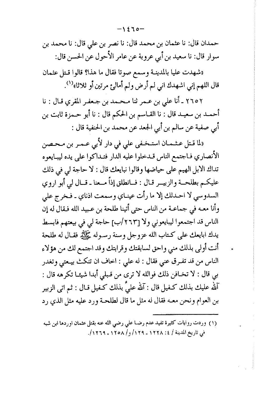 2652 - أنا عَلِيُّ بْنُ عُمَرَ، ثنا مُحَمَّدُ بْنُ جَعْفَرٍ الْمُقْرِي، قَالَ: نا أَحْمَدُ بْنُ سَعِيدٍ، قَالَ: نا الْقَاسِمُ بْنُ الْحَكَمِ، قَالَ: نا أَبُو حَمْزَةَ ثَابِتُ بْنُ أَبِي صَفِيَّةَ، عَنْ سَالِمِ بْنِ أَبِي الْجَعْدِ، عَنْ مُحَمَّدِ ابْنِ الْحَنَفِيَّةِ، قَالَ: لَمَّا قُتِلَ عُثْمَانُ اسْتَخْفَى عَلِيٌّ فِي دَارٍ لِأَبِي عُمَرَ بْنِ مِحْصَنٍ الْأَنْصَارِيِّ، فَاجْتَمَعَ النَّاسُ فَدَخَلُوا عَلَيْهِ الدَّارَ، فَتَدَاكُّوا عَلَى يَدِهِ لِيُبَايِعُوهُ تَدَاكَّ الْإِبِلِ الْهِيمِ عَلَى حِيَاضِهَا، وَقَالُوا: نُبَايِعُكَ. قَالَ: §لَا حَاجَةَ لِي فِي ذَلِكَ، عَلَيْكُمْ بِطَلْحَةَ وَالزُّبَيْرِ. قَالَ: فَانْطَلِقْ إِذًا مَعَنَا. قَالَ لِي أَبُو أَرْوَى السَّدُوسِيُّ: لَا أُحَدِّثُكَ إِلَّا مَا رَأَتْ عَيْنَايَ وَسَمِعَتْ أُذُنَايَ. فَخَرَجَ عَلِيٌّ وَأَنَا مَعَهُ فِي جَمَاعَةٍ مِنَ النَّاسِ حَتَّى أَتَيْنَا طَلْحَةَ بْنَ عُبَيْدِ اللَّهِ، فَقَالَ لَهُ: إِنَّ النَّاسَ قَدِ اجْتَمَعُوا لِيُبَايِعُونِي، وَلَا حَاجَةَ لِي فِي بَيْعَتِهِمْ، فَابْسُطْ يَدَكَ أُبَايِعْكَ عَلَى كِتَابِ اللَّهِ عَزَّ وَجَلَّ وَسُنَّةِ رَسُولِهِ صَلَّى اللهُ عَلَيْهِ وَسَلَّمَ. فَقَالَ لَهُ طَلْحَةُ: أَنْتَ أَوْلَى بِذَلِكَ مِنِّي وَأَحَقُّ؛ لِسَابِقَتِكَ وَقَرَابَتِكَ، وَقَدِ اجْتَمَعَ لَكَ مِنْ هَؤُلَاءِ النَّاسِ مَنْ قَدْ تَفَرَّقَ عَنِّي. فَقَالَ لَهُ عَلِيٌّ: أَخَافُ أَنْ تَنْكُثَ بَيْعَتِي وَتَغْدِرَ بِي. قَالَ: لَا تَخَافَنَّ ذَلِكَ، فَوَاللَّهِ لَا تَرَى مِنْ قِبَلِي أَبَدًا شَيْئًا تَكْرَهُهُ. قَالَ: اللَّهُ عَلَيْكَ بِذَلِكَ كَفِيلٌ. قَالَ: اللَّهُ عَلَيَّ بِذَلِكَ كَفِيلٌ. قَالَ: ثُمَّ أَتَى الزُّبَيْرَ بْنَ الْعَوَّامِ، وَنَحْنُ مَعَهُ، فَقَالَ لَهُ مِثْلَ مَا قَالَ لِطَلْحَةَ، وَرَدَّ عَلَيْهِ مِثْلَ الَّذِي رَدَّ -[1466]- عَلَيْهِ طَلْحَةُ، وَكَانَ طَلْحَةُ قَدْ أَخَذَ لِقَاحًا لِعُثْمَانَ، وَمَفَاتِيحَ بَيْتِ الْمَالِ، وَكَانَ النَّاسُ قَدِ اجْتَمَعُوا عَلَيْهِ لِيُبَايِعُوهُ، وَلَمْ يَفْعَلُوا، فَضَرَبَتِ الرُّكْبَانُ بِخَبَرِهِ إِلَى عَائِشَةَ وَهِيَ بِسَرِفَ، فَقَالَتْ: كَأَنِّي أَنْظُرُ إِلَى إِصْبَعِهِ تُبَايِعُ بِخِبٍّ وَغَرَرٍ. قَالَ سَالِمٌ: وَقَالَ ابْنُ الْحَنَفِيَّةِ: لَمَّا اجْتَمَعَ النَّاسُ عَلَى عَلِيٍّ قَالُوا لَهُ: إِنَّ هَذَا الرَّجُلَ قَدْ قُتِلَ، وَلَا بُدَّ لِلنَّاسِ مِنْ إِمَامٍ، وَلَا نَجِدُ لِهَذَا الْأَمْرِ أَحَقَّ مِنْكَ، وَلَا أَقْدَمَ سَابِقَةً، وَلَا أَقْرَبَ بِرَسُولِ اللَّهِ صَلَّى اللهُ عَلَيْهِ وَسَلَّمَ رَحِمًا مِنْكَ. قَالَ: لَا تَفْعَلُوا، فَإِنِّي وَزِيرٌ خَيْرٌ مِنِّي لَكُمْ أَمِيرًا. قَالُوا: وَاللَّهِ مَا نَحْنُ بِفَاعِلِينَ أَبَدًا حَتَّى نُبَايِعَكَ. وَتَدَاكُّوا عَلَى يَدِهِ، فَلَّمَا رَأَى ذَلَكَ قَالَ: إِنَّ بَيْعَتِي لَا تَكُونُ فِي خَلْوَةٍ إِلَّا فِي الْمَسْجِدِ ظَاهِرًا. وَأَمَرَ مُنَادِيًا، فَنَادَى: الْمَسْجِدَ الْمَسْجِدَ، فَخَرَجَ، وَخَرَجَ النَّاسُ مَعَهُ، فَصَعِدَ الْمِنْبَرَ، فَحَمِدَ اللَّهَ وَأَثْنَى عَلَيْهِ، ثُمَّ قَالَ: حَقٌّ وَبَاطِلٌ، وَلِكُلٍّ أَهْلٌ، فَلَئِنْ كَثُرَ الْبَاطِلُ لَقَدْ نَمَا بِمَا فُعِلَ، وَلَئِنْ قَلَّ الْحَقُّ، وَلَرُبَّمَا وَلَقَلَّمَا أَدْبَرَ شَيْءٌ فَأَقْبَلَ، وَلَئِنْ رُدَّ عَلَيْكُمْ أَمْرُكُمْ إِنَّكُمْ لَسُعَدَاءُ، وَإِنِّي أَخْشَى أَنْ تَكُونُوا فِي فَتْرَةٍ، وَمَا عَلَيَّ إِلَّا الْجَهْدُ، سَبَقَ الرَّجُلَانِ، وَقَامَ الثَّالِثُ ثَلَاثَةٍ، وَاثْنَانِ لَيْسَ مَعَهُمَا سَادِسٌ، مَلَكٌ مُقَرَّبٌ، وَمَنْ أَخَذَ اللَّهُ مِيثَاقَهُ، وَصِدِّيقٌ نَجَا، وَسَاعٍ مُجْتَهِدٌ، وَطَالِبٌ 