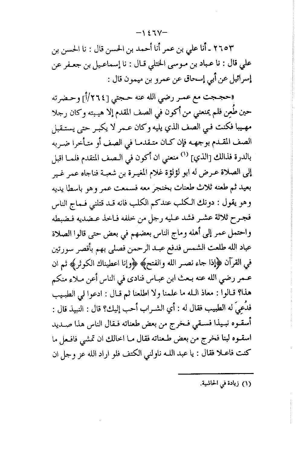 2653 - أنا عَلِيُّ بْنُ عُمَرَ، أنا أَحْمَدُ بْنُ الْحَسَنِ، قَالَ: نا الْحَسَنُ بْنُ عَلِيٍّ، قَالَ: نا عَبَّادُ بْنُ مُوسَى الْخُتَّلِيُّ، قَالَ: نا إِسْمَاعِيلُ بْنُ جَعْفَرٍ، عَنْ إِسْرَائِيلَ، عَنْ أَبِي إِسْحَاقَ، عَنْ عَمْرِو بْنِ مَيْمُونٍ، قَالَ: حَجَجْتُ مَعَ عُمَرَ رَضِيَ اللَّهُ عَنْهُ حَجَّتِي، وَحَضَرْتُهُ حِينَ طُعِنَ، فَلَمْ يَمْنَعْنِي مِنْ أَنْ أَكُونَ فِي الصَّفِّ الْمُقَدَّمِ إِلَّا هَيْبَتُهُ، وَكَانَ رَجُلًا مَهِيبًا، فَكُنْتُ فِي الصَّفِّ الَّذِي يَلِيهِ، وَكَانَ عُمَرُ لَا يُكَبِّرُ حَتَّى يَسْتَقْبِلَ الصَّفَّ الْمُقَدَّمَ بِوَجْهِهِ، فَإِنْ كَانَ مُتَقَدِّمًا فِي الصَّفِّ أَوْ مُتَأَخِّرٌ ضَرَبَهُ بِالدِّرَّةِ، فَذَلِكَ الَّذِي مَنَعَنِي أَنْ أَكُونَ فِي الصَّفِّ الْمُتَقَدِّمِ، فَلَمَّا أَقْبَلَ إِلَى الصَّلَاةِ عَرَضَ لَهُ أَبُو لُؤْلُؤَةَ غُلَامُ الْمُغِيرَةِ بْنِ شُعْبَةَ، فَنَاجَاهُ عُمَرُ غَيْرَ بَعِيدٍ، ثُمَّ طَعَنَهُ ثَلَاثَ طَعَنَاتٍ بِخِنْجَرٍ مَعَهُ، فَسَمِعْتُ عُمَرَ وَهُوَ بَاسِطٌ يَدَيْهِ، وَهُوَ يَقُولُ: دُونَكَمُ الْكَلْبَ، عِنْدَكُمُ الْكَلْبَ، فَإِنَّهُ قَدْ قَتَلَنِي. فَمَاجَ النَّاسُ، فَجُرِحَ ثَلَاثَةَ عَشَرَ، فَشَدَّ عَلَيْهِ رَجُلٌ مِنْ خَلْفِهِ، فَأَخَذَ عَضُدَيْهِ فَضَبَطَهُ، وَاحْتُمِلَ عُمَرُ إِلَى أَهْلِهِ، وَمَاجَ النَّاسُ بَعْضُهُمْ فِي بَعْضٍ، حَتَّى قَالُوا: الصَّلَاةُ عِبَادَ اللَّهِ طَلُعَتِ الشَّمْسُ، فَدَفَعَ عَبْدُ الرَّحْمَنِ فَصَلَّى بِهِمْ بِأَقْصَرِ سُورَتَيْنِ فِي الْقُرْآنِ: إِذَا جَاءَ نَصْرُ اللَّهِ وَالْفَتْحُ، وَإِنَّا أَعْطَيْنَاكَ الْكَوْثَرَ، ثُمَّ إِنَّ عُمَرَ رَضِيَ اللَّهُ عَنْهُ بَعَثَ ابْنَ عَبَّاسٍ، فَنَادَى فِي النَّاسِ أَعَنْ مَلَإٍ مِنْكُمْ هَذَا؟ قَالُوا: مَعَاذَ اللَّهِ مَا عَلِمْنَا وَلَا اطَّلَعْنَا. ثُمَّ قَالَ: ادْعُوا لِيَ الطَّبِيبَ. فَدُعِيَ لَهُ الطَّبِيبُ، فَقَالَ لَهُ: أَيُّ الشَّرَابِ أَحَبُّ إِلَيْكَ؟ قَالَ: النَّبِيذُ. قَالَ: اسْقُوهُ نَبِيذًا، فَسُقِيَ، فَخَرَجَ مِنْ بَعْضِ طَعَنَاتِهِ، فَقَالَ النَّاسُ: هَذَا صَدِيدٌ، اسْقُوهُ لَبَنًا، فَخَرَجَ مِنْ بَعْضِ طَعَنَاتَهِ، فَقَالَ: مَا إِخَالُكَ أَنْ تَمْشِيَ، فَافْعَلْ مَا كُنْتَ فَاعِلًا. فَقَالَ: يَا عَبْدَ اللَّهِ نَاوِلْنِي الْكَتِفَ، فَلَوْ أَرَادَ اللَّهُ عَزَّ وَجَلَّ أَنْ -[1468]- يُمْضِيَ مَا فِيهَا أَمْضَاهُ. قَالَ: أَنَا أَكْفِيكَ مَحْوَهَا. قَالَ: لَا وَاللَّهِ لَا يَمْحُوهَا أَحَدٌ غَيْرِي. فَمَحَاهَا عُمَرُ بِيَدِهِ. قَالَ: وَكَانَ فِيهَا فَرِيضَةُ الْجَدِّ، ثُمَّ قَالَ: ادْعُوا لِي عَلِيًّا، وَعُثْمَانَ، وَطَلْحَةَ، وَالزُّبَيْرَ، وَعَبْدَ الرَّحْمَنِ، وَسَعْدًا. قَالَ: فَمَا كَلَّمَ مِنَ الْقَوْمِ غَيْرَ عَلِيٍّ وَعُثْمَانَ، فَقَالَ: يَا عَلِيُّ، لَعَلَّ هَؤُلَاءِ يَعْرِفُونَ لَكَ قَرَابَتَكَ بِرَسُولِ اللَّهِ صَلَّى اللهُ عَلَيْهِ وَسَلَّمَ، وَمَا أَعْطَاكَ مِنَ الْفِقْهِ وَالْعِلْمِ، فَإِنْ وُلِّيتَ هَذَا الْأَمْرَ فَاتَّقِ اللَّهَ فِيهِ. قَالَ: ثُمَّ دَعَا عُثْمَانَ، فَقَالَ: يَا عُثْمَانُ، لَعَلَّ الْقَوْمَ يَعْرِفُونَ لَكَ صِهْرَكَ مِنْ رَسُولِ اللَّهِ وَشَرَفَكَ، فَإِنْ وُلِّيتَ هَذَا الْأَمْرَ فَاتَّقِ اللَّهَ، وَلَا تَحْمِلْ بَنِي أَبِي مُغِيرَةَ عَلَى رِقَابِ الْمُسْلِمِينَ. ثُمَّ قَالَ: ادْعُوا لِي صُهَيْبًا. فَدَعَوْا لَهُ صُهَيْبًا، فَقَالَ: صَلِّ بِالنَّاسِ ثَلَاثًا، وَاجْعَلْ هَؤُلَاءِ الْقَوْمَ فِي بَيْتٍ، فَإِذَا اجْتَمَعُوا عَلَى رَجُلٍ، فَمَنْ خَالَفَهُمْ فَلْيَضْرِبُوا عُنُقَهُ. قَالَ: فَلَمَّا أَنْ أَدْبَرُوا قَالَ: §إِنْ وَلَّوْهَا الْأَجْلَحَ سَلَكَ بِهِمُ الطَّرِيقَ. يَعْنِي ع