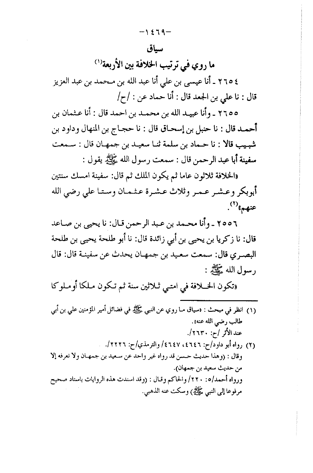 2655 - وَأنا عُبَيْدُ اللَّهِ بْنُ مُحَمَّدٍ، قَالَ: أنا عُثْمَانُ بْنُ أَحْمَدَ، قَالَ: نا حَنْبَلُ بْنُ إِسْحَاقَ، قَالَ: نا حَجَّاجُ بْنُ الْمِنْهَالِ، وَدَاوُدُ بْنُ شَبِيبٍ، قَالَا: نا حَمَّادُ بْنُ سَلَمَةَ، ثنا سَعِيدُ بْنُ جُمْهَانَ، قَالَ: سَمِعْتُ سَفِينَةَ أَبَا عَبْدِ الرَّحْمَنِ قَالَ: سَمِعْتُ رَسُولَ اللَّهِ صَلَّى اللهُ عَلَيْهِ وَسَلَّمَ يَقُولُ: «§الْخِلَافَةُ ثَلَاثُونَ عَامًا، ثُمَّ يَكُونُ الْمُلْكُ» . ثُمَّ قَالَ سَفِينَةُ: أَمْسَكَ سَنَتَيْنِ أَبُو بَكْرٍ، وَعَشْرًا عُمَرُ، وَثَلَاثَ عَشْرَةَ عُثْمَانُ، وَسِتًّا عَلِيٌّ، رَضِيَ اللَّهُ عَنْهُمْ "