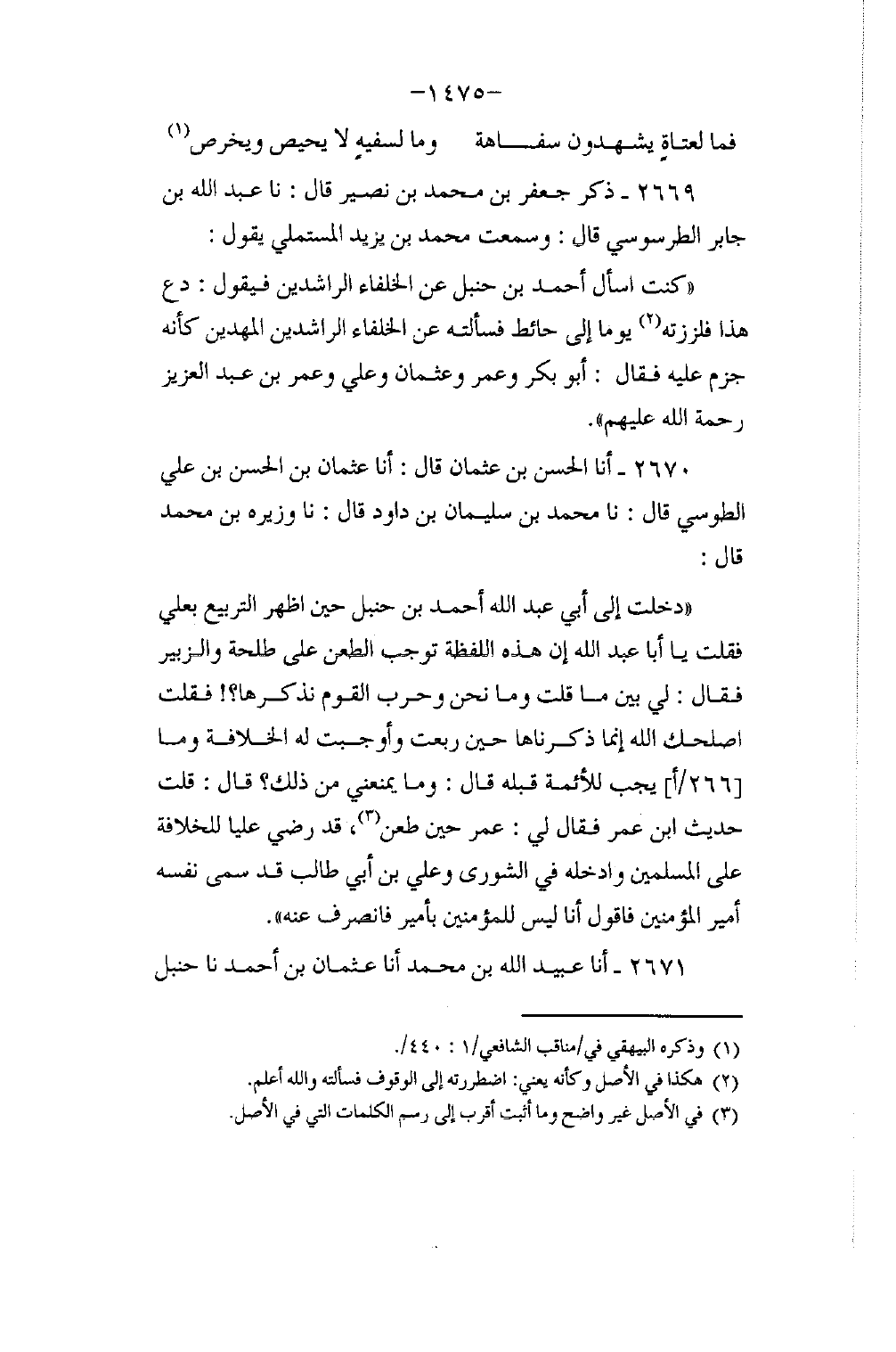 2669 - ذَكَرَ جَعْفَرُ بْنُ مُحَمَّدِ بْنِ نُصَيْرٍ قَالَ: نا عَبْدُ اللَّهِ بْنُ جَابِرٍ الطُّوسِيُّ، قَالَ: وَسَمِعْتُ مُحَمَّدَ بْنَ يَزِيدَ الْمُسْتَمْلِيَ يَقُولُ: كُنْتُ أَسْأَلُ أَحْمَدَ بْنَ حَنْبَلٍ عَنِ الْخُلَفَاءِ الرَّاشِدِينَ، فَيَقُولُ: دَعْ هَذَا. فَلَزَزْتُهُ يَوْمًا إِلَى حَائِطٍ، فَسَأَلْتُهُ عَنِ الْخُلَفَاءِ الرَّاشِدِينَ الْمَهْدِيِّينَ كَأَنَّهُ جَزْمٌ عَلَيْهِ، فَقَالَ: §أَبُو بَكْرٍ، وَعُمَرُ، وَعُثْمَانُ، وَعَلِيٌّ، وَعُمَرُ بْنُ عَبْدِ الْعَزِيزِ رَحْمَةُ اللَّهِ عَلَيْهِمْ