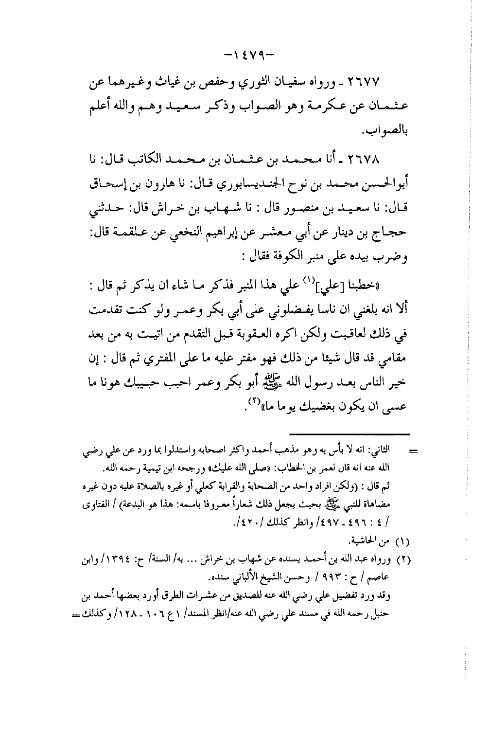 2678 - أنا مُحَمَّدُ بْنُ عُثْمَانَ بْنِ مُحَمَّدٍ الْكَاتِبُ، قَالَ: نا أَبُو الْحَسَنِ مُحَمَّدُ بْنُ نُوحٍ الْجُنْدَيْسَابُورِيُّ قَالَ: نا هَارُونُ بْنُ إِسْحَاقَ، قَالَ: نا سَعِيدُ بْنُ مَنْصُورٍ، قَالَ: نا شِهَابُ بْنُ خِرَاشٍ، قَالَ: حَدَّثَنِي حَجَّاجُ بْنُ دِينَارٍ، عَنْ أَبِي مَعْشَرٍ، عَنْ إِبْرَاهِيمَ النَّخَعِيِّ، عَنْ عَلْقَمَةَ، قَالَ: وَضَرَبَ بِيَدِهِ عَلَى مِنْبَرِ الْكُوفَةِ، فَقَالَ: خَطَبَنَا عَلِيٌّ عَلَى هَذَا الْمِنْبَرِ، فَذَكَرَ مَا شَاءَ أَنْ يَذْكُرَ، ثُمَّ قَالَ: أَلَا إِنَّهُ بَلَغَنِي أَنَّ نَاسًا يُفَضِّلُونَنِي عَلَى أَبِي بَكْرٍ وَعُمَرَ، وَلَوْ كُنْتُ تَقَدَّمْتُ فِي ذَلِكَ لَعَاقَبْتُ، وَلَكِنْ أَكْرَهُ الْعُقُوبَةَ قَبْلَ التَّقَدُّمِ، مَنْ أُتِيتُ بِهِ مِنْ بَعْدِ مَقَامِي قَدْ قَالَ شَيْئًا مِنْ ذَلِكَ فَهُوَ مُفْتَرٍ، عَلَيْهِ مَا عَلَى الْمُفْتَرِي. ثُمَّ قَالَ: §إِنَّ خَيْرَ النَّاسِ بَعْدَ رَسُولِ اللَّهِ صَلَّى اللهُ عَلَيْهِ وَسَلَّمَ أَبُو بَكْرٍ وَعُمَرُ، أَحْبِبْ حَبِيبَكَ هَوْنًا مَا عَسَى أَنْ يَكُونَ بَغِيضَكَ يَوْمًا مَا