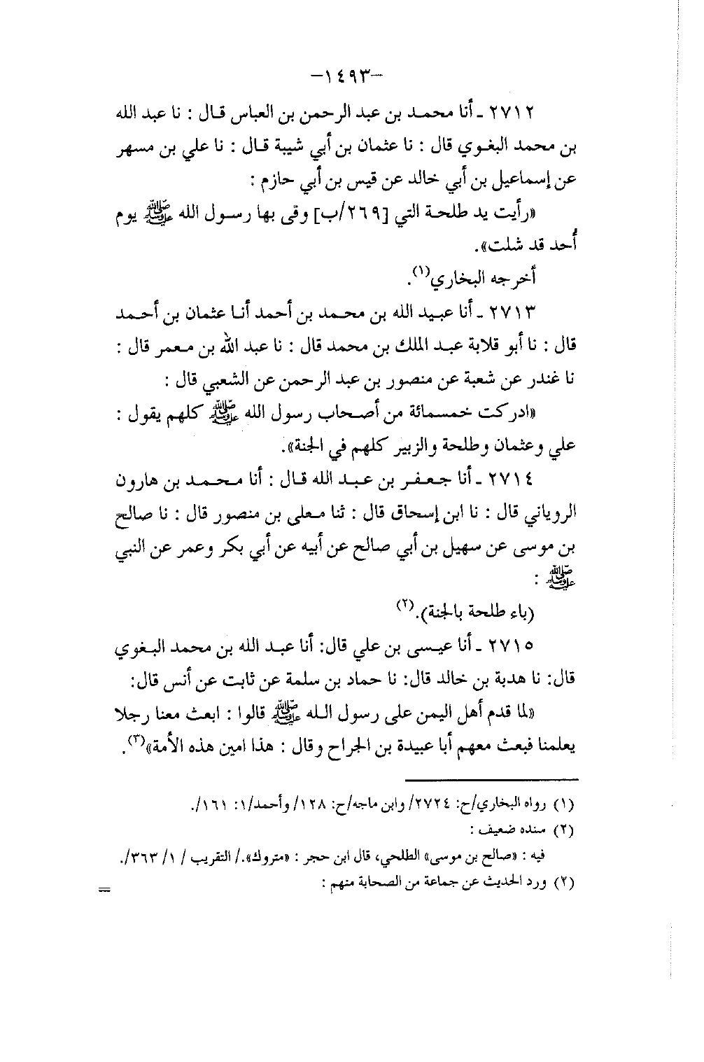 2712 - أنا مُحَمَّدُ بْنُ عَبْدِ الرَّحْمَنِ بْنِ الْعَبَّاسِ، قَالَ: نا عَبْدُ اللَّهِ بْنُ مُحَمَّدٍ الْبَغَوِيُّ، قَالَ: نا عُثْمَانُ بْنُ أَبِي شَيْبَةَ، قَالَ: نا عَلِيُّ بْنُ مُسْهِرٍ، عَنْ إِسْمَاعِيلَ بْنِ أَبِي خَالِدٍ، عَنْ قَيْسِ بْنِ أَبِي حَازِمٍ: §رَأَيْتُ يَدَ طَلْحَةَ الَّتِي وَقَى بِهَا رَسُولَ اللَّهِ صَلَّى اللهُ عَلَيْهِ وَسَلَّمَ يَوْمَ أُحُدٍ قَدْ شُلَّتْ " أَخْرَجَهُ الْبُخَارِيُّ