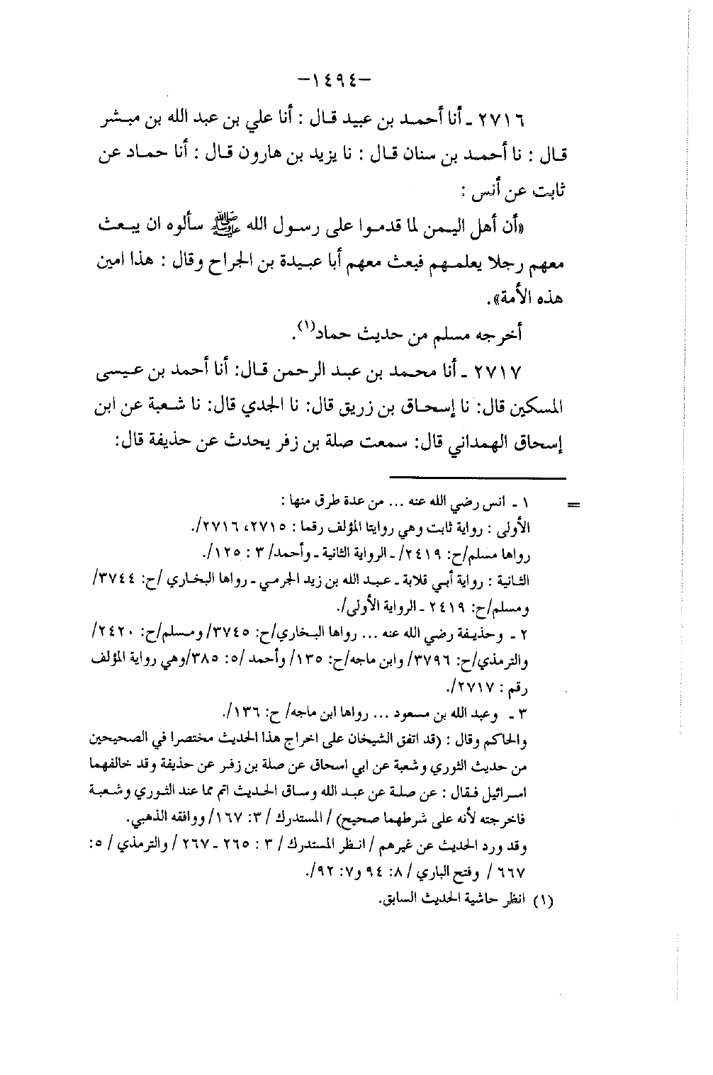 2716 - أنا أَحْمَدُ بْنُ عُبَيْدٍ، قَالَ: أنا عَلِيُّ بْنُ عَبْدِ اللَّهِ بْنِ مُبَشِّرٍ، قَالَ: نا أَحْمَدُ بْنُ سِنَانٍ، قَالَ: نا يَزِيدُ بْنُ هَارُونَ، قَالَ: أنا حَمَّادٌ، عَنْ ثَابِتٍ، عَنْ أَنَسٍ أَنَّ أَهْلَ الْيَمَنِ لَمَّا قَدِمُوا عَلَى رَسُولِ اللَّهِ صَلَّى اللهُ عَلَيْهِ وَسَلَّمَ، سَأَلُوهُ أَنْ يَبْعَثَ مَعَهُمْ رَجُلًا يُعَلِّمُهُمْ، فَبَعَثَ مَعَهُمْ أَبَا عُبَيْدَةَ بْنَ الْجَرَّاحِ، وَقَالَ: §«هَذَا أَمِينُ هَذِهِ الْأُمَّةِ» أَخْرَجَهُ مُسْلِمٌ مِنْ حَدِيثِ حَمَّادٍ
