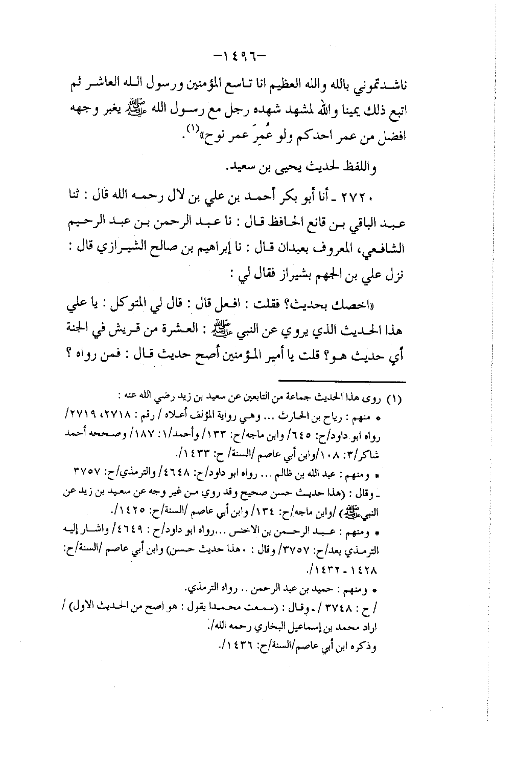 2720 - أنا أَبُو بَكْرٍ أَحْمَدُ بْنُ عَلِيِّ بْنِ لَالٍ رَحِمَهُ اللَّهُ قَالَ: ثنا عَبْدُ الْبَاقِي بْنُ قَانِعٍ الْحَافِظُ، قَالَ: نا عَبْدُ الرَّحْمَنِ بْنُ عَبْدِ الرَّحِيمِ الشَّافِعِيُّ الْمَعْرُوفُ بعَبْدَانَ، قَالَ: نا إِبْرَاهِيمُ بْنُ صَالِحٍ الشِّيرَازِيُّ، قَالَ: نَزَلَ عَلِيُّ بْنُ الْجَهْمِ بِشِيرَازَ، فَقَالَ لِي: أَخُصُّكَ بِحَدِيثٍ؟ فَقُلْتُ: افْعَلْ. قَالَ: قَالَ لِيَ الْمُتَوَكِّلُ: يَا عَلِيُّ هَذَا الْحَدِيثُ الَّذِي يُرْوَى عَنِ النَّبِيِّ صَلَّى اللهُ عَلَيْهِ وَسَلَّمَ: «الْعَشَرَةُ مِنْ قُرَيْشٍ فِي الْجَنَّةِ» ، أَيُّ حَدِيثٍ هُوَ؟ قُلْتُ: يَا أَمِيرَ الْمُؤْمِنِينَ أَصَحُّ حَدِيثٍ. قَالَ: فَمَنْ رَوَاهُ؟ -[1497]- قُلْتُ: رَوَاهُ سُفْيَانُ الثَّوْرِيُّ، عَنْ مَنْصُورٍ، عَنْ هِلَالِ بْنِ يَسَافٍ، عَنْ عَبْدِ اللَّهِ بْنِ ظَالِمٍ، عَنْ سَعِيدِ بْنِ زَيْدٍ قَالَ: قَالَ رَسُولُ اللَّهِ صَلَّى اللهُ عَلَيْهِ وَسَلَّمَ: «§عَشَرَةٌ فِي الْجَنَّةِ» فَقَالَ: مَا أَحْسَنَهُ. قُلْتُ: يَا أَمِيرَ الْمُؤْمِنِينَ، وَقَدْ حَضَرَنِي شَيْءٌ فَأَقُولُهُ؟ قَالَ: قُلْ. فَقُلْتُ: