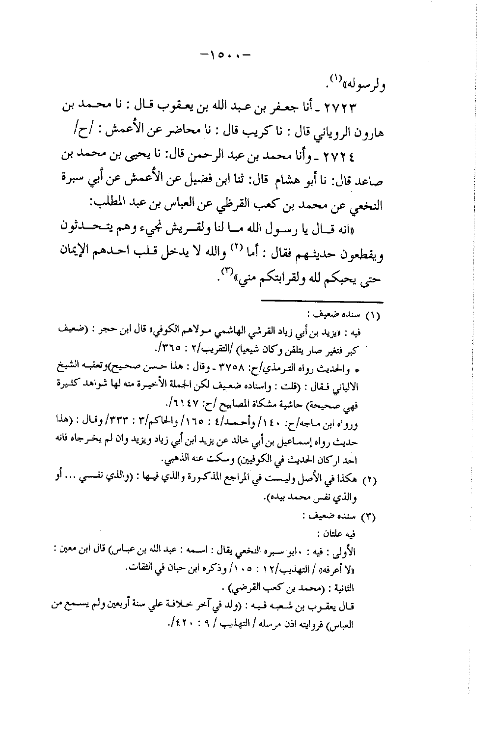 2723 - أنا جَعْفَرُ بْنُ عَبْدِ اللَّهِ بْنِ يَعْقُوبَ، قَالَ: نا مُحَمَّدُ بْنُ هَارُونَ الرُّويَانِيُّ، قَالَ: نا أَبُو كُرَيْبٍ، قَالَ: نا مُحَاضِرٌ، عَنِ الْأَعْمَشِ ح وَأنا مُحَمَّدُ بْنُ عَبْدِ الرَّحْمَنِ، قَالَ: نا يَحْيَى بْنُ مُحَمَّدِ بْنِ صَاعِدٍ، قَالَ: نا أَبُو هِشَامٍ، قَالَ: ثنا ابْنُ فُضَيْلٍ، عَنِ الْأَعْمَشِ، عَنْ أَبِي سَبْرَةَ النَّخَعِيِّ، عَنْ مُحَمَّدِ بْنِ كَعْبٍ الْقُرَظِيِّ، عَنِ الْعَبَّاسِ بْنِ عَبْدِ الْمُطَّلِبِ أَنَّهُ قَالَ: يَا رَسُولَ اللَّهِ مَا لَنَا وَلِقُرَيْشٍ نَجِيءُ وَهُمْ يَتَحَدَّثُونَ وَيَقْطَعُونَ حَدِيثَهُمْ. فَقَالَ: «وَاللَّهِ §لَا يَدْخُلُ قَلْبَ أَحَدِهِمُ الْإِيمَانُ حَتَّى يُحِبَّكُمْ لِلَّهِ وَلِقَرَابَتِكُمْ مِنِّي» -[1501]- وَاللَّفْظُ لِحَدِيثِ يَحْيَى