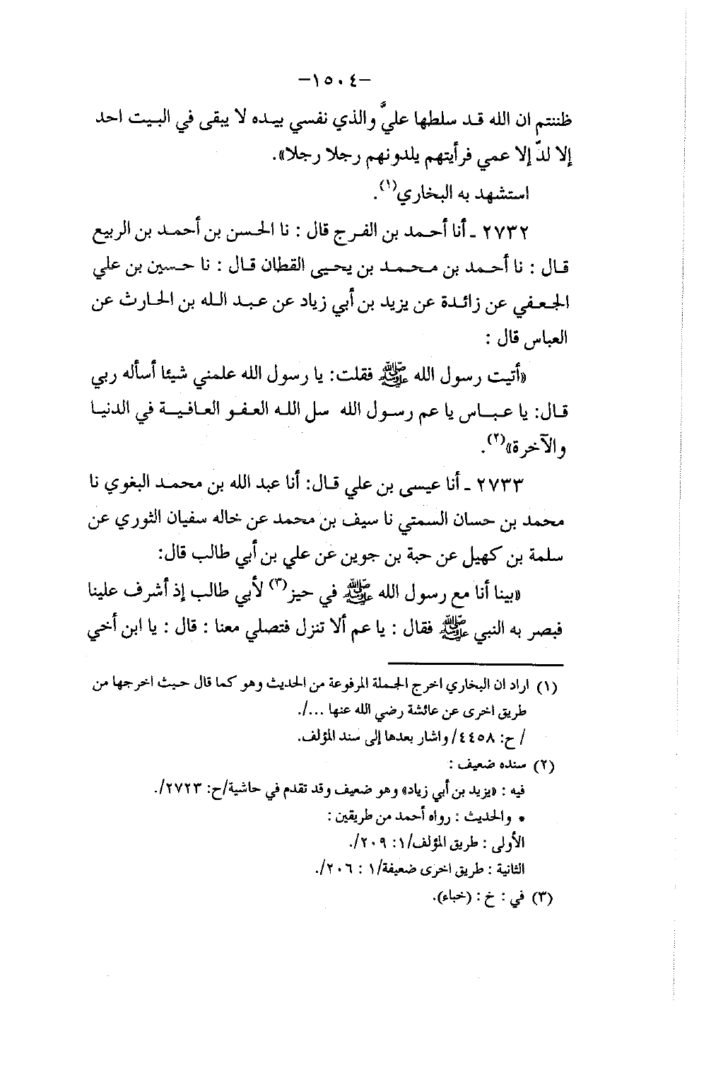 2732 - أنا أَحْمَدُ بْنُ الْفَرَجِ، قَالَ: نا الْحَسَنُ بْنُ أَحْمَدَ بْنِ الرَّبِيعِ، قَالَ: نا أَحْمَدُ بْنُ مُحَمَّدِ بْنِ يَحْيَى الْقَطَّانُ، قَالَ: نا حُسَيْنُ بْنُ عَلِيٍّ الْجُعْفِيُّ، عَنْ زَائِدَةَ، عَنْ يَزِيدَ بْنِ أَبِي زِيَادٍ، عَنْ عَبْدِ اللَّهِ بْنِ الْحَارِثِ، عَنِ الْعَبَّاسِ، قَالَ: " أَتَيْتُ رَسُولَ اللَّهِ صَلَّى اللهُ عَلَيْهِ وَسَلَّمَ، فَقُلْتُ: يَا رَسُولَ اللَّهِ عَلِّمْنِي شَيْئًا أَسْأَلُهُ رَبِّي. قَالَ: «يَا عَبَّاسُ يَا عَمَّ رَسُولِ اللَّهِ، §سَلِ اللَّهَ الْعَفْوَ وَالْعَافِيَةَ فِي الدُّنْيَا وَالْآخِرَةِ»