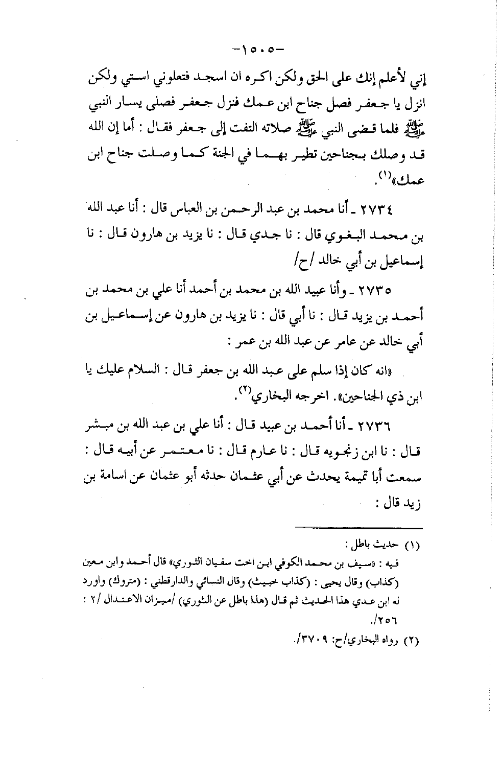 2735 - وَأَنَا عُبَيْدُ اللَّهِ بْنُ مُحَمَّدِ بْنِ أَحْمَدَ، أنا عَلِيُّ بْنُ مُحَمَّدِ بْنِ أَحْمَدَ بْنِ يَزِيدَ، قَالَ: نا أَبِي قَالَ: نا يَزِيدُ بْنُ هَارُونَ، عَنْ إِسْمَاعِيلَ بْنِ أَبِي خَالِدٍ، عَنْ عَامِرٍ، عَنْ عَبْدِ اللَّهِ بْنِ عُمَرَ، أَنَّهُ كَانَ إِذَا سَلَّمَ عَلَى عَبْدِ اللَّهِ بْنِ جَعْفَرٍ قَالَ: §السَّلَامُ عَلَيْكَ يَا ابْنَ ذِي الْجَنَاحَيْنِ أَخْرَجَهُ الْبُخَارِيُّ