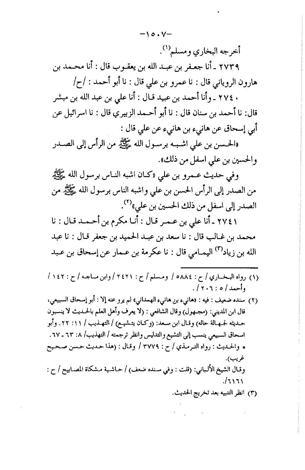 2740 - وَأَنَا أَحْمَدُ بْنُ عُبَيْدٍ، قَالَ: أنا عَلِيُّ بْنُ عَبْدِ اللَّهِ بْنِ مُبَشِّرٍ، قَالَ: نا أَحْمَدُ بْنُ سِنَانٍ، قَالَ: نا أَبُو أَحْمَدَ الزُّبَيْرِيُّ، قَالَ: نا إِسْرَائِيلُ، عَنْ أَبِي إِسْحَاقَ، عَنْ هَانِئِ بْنِ هَانِئٍ، عَنْ عَلِيٍّ، قَالَ: §الْحَسَنُ بْنُ عَلِيٍّ أَشْبَهُ بِرَسُولِ اللَّهِ صَلَّى اللهُ عَلَيْهِ وَسَلَّمَ مِنَ الرَّأْسِ إِلَى الصَّدْرِ، وَالْحُسَيْنُ بْنُ عَلِيٍّ أَسْفَلَ مِنْ ذَلِكَ " وَفِي حَدِيثِ عَمْرِو بْنِ عَلِيٍّ: «كَانَ أَشْبَهَ النَّاسِ بِرَسُولِ اللَّهِ صَلَّى اللهُ عَلَيْهِ وَسَلَّمَ مِنَ الصَّدْرِ إِلَى الرَّأْسِ الْحَسَنُ بْنُ عَلِيٍّ، وَأَشْبَهَ النَّاسِ بِرَسُولِ اللَّهِ صَلَّى اللهُ عَلَيْهِ وَسَلَّمَ مِنَ الصَّدْرِ إِلَى أَسْفَلَ مِنْ ذَلِكَ الْحُسَيْنُ بْنُ عَلِيٍّ»