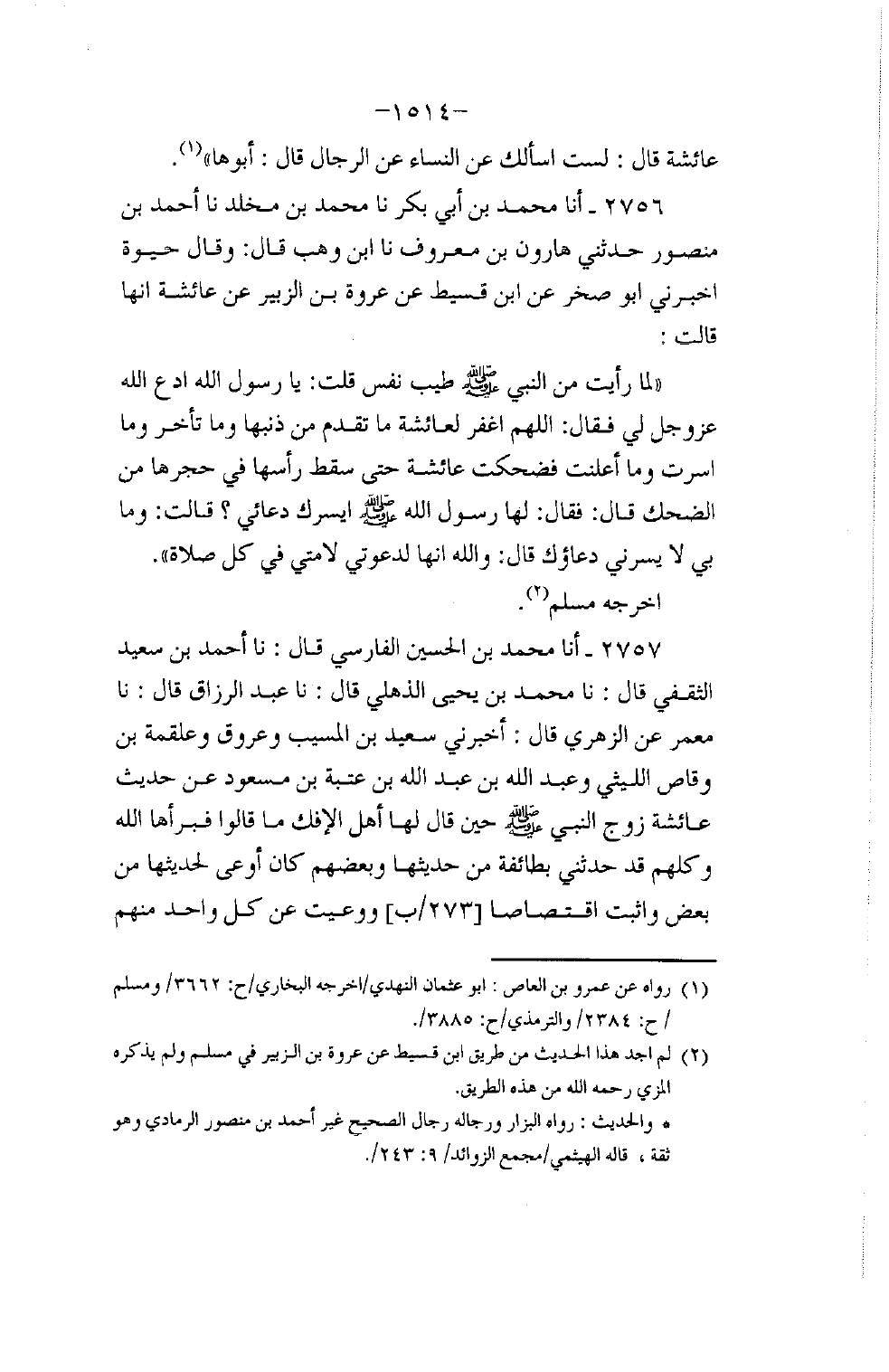 2756 - أنا مُحَمَّدُ بْنُ أَبِي بَكْرٍ، نا مُحَمَّدُ بْنُ مَخْلَدٍ، نا أَحْمَدُ بْنُ مَنْصُورٍ، حَدَّثَنِي هَارُونُ بْنُ مَعْرُوفٍ، نا ابْنُ وَهْبٍ، قَالَ: وَقَالَ حَيْوَةُ: أَخْبَرَنِي أَبُو صَخْرٍ، عَنِ ابْنِ قُسَيْطٍ، عَنْ عُرْوَةَ بْنِ الزُّبَيْرِ، عَنْ عَائِشَةَ، أَنَّهَا قَالَتْ: " لَمَّا رَأَيْتُ مِنَ النَّبِيِّ صَلَّى اللهُ عَلَيْهِ وَسَلَّمَ طِيبَ نَفْسٍ، قُلْتُ: يَا رَسُولَ اللَّهِ ادْعُ اللَّهَ عَزَّ وَجَلَّ لِي، فَقَالَ: «§اللَّهُمَّ اغْفِرْ لِعَائِشَةَ مَا تَقَدَّمَ مِنْ ذَنْبِهَا وَمَا تَأَخَّرَ، وَمَا أَسَرَّتْ وَمَا أَعْلَنَتْ» . فَضَحِكَتْ عَائِشَةُ حَتَّى سَقَطَ رَأْسُهَا فِي حِجْرِهَا مِنَ الضَّحِكِ. قَالَ: فَقَالَ: لَهَا رَسُولُ اللَّهِ صَلَّى اللهُ عَلَيْهِ وَسَلَّمَ: «أَيَسُرُّكِ دُعَائِي» ؟ قَالَتْ: وَمَا بِي لَا يَسُرُّنِي دُعَاؤُكَ. قَالَ: «وَاللَّهِ إِنَّهَا لَدَعْوَتِي لِأُمَّتِي فِي كُلِّ صَلَاةٍ» أَخْرَجَهُ مُسْلِمٌ