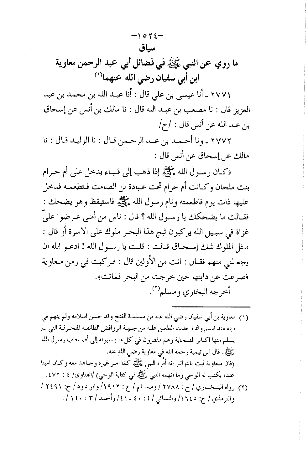 2772 - ونَا أَحْمَدُ بْنُ عَبْدِ الرَّحْمَنِ، قَالَ: نا الْوَلِيدُ، قَالَ: نا مَالِكٌ، عَنْ إِسْحَاقَ، عَنْ أَنَسٍ، قَالَ: كَانَ رَسُولُ اللَّهِ صَلَّى اللهُ عَلَيْهِ وَسَلَّمَ إِذَا ذَهَبَ إِلَى قُبَاءٍ يَدْخُلُ عَلَى أُمِّ حَرَامٍ بِنْتِ مِلْحَانَ، وَكَانَتْ أُمُّ حَرَامٍ تَحْتَ عُبَادَةَ بْنِ الصَّامِتِ، فَتُطْعِمُهُ، فَدَخَلَ عَلَيْهَا ذَاتَ يَوْمٍ فَأَطْعَمَتْهُ، وَنَامَ رَسُولُ اللَّهِ صَلَّى اللهُ عَلَيْهِ وَسَلَّمَ، فَاسْتَيْقَظَ وَهُوَ يَضْحَكُ، فَقَالَتْ: مَا يُضْحِكُكَ يَا رَسُولَ اللَّهِ؟ قَالَ: «§نَاسٌ مِنْ أُمَّتِي عُرِضُوا عَلَيَّ، غُزَاةٌ فِي سَبِيلِ اللَّهِ يَرْكَبُونَ ثَبَجَ هَذَا الْبَحْرِ، مُلُوكٌ عَلَى الْأَسِرَّةِ» أَوْ قَالَ: مِثْلُ الْمُلُوكِ "، شَكَّ إِسْحَاقُ. قَالَتْ: قُلْتُ: يَا رَسُولَ اللَّهِ، ادْعُ اللَّهَ أَنْ يَجْعَلَنِيَ مِنْهُمْ. فَقَالَ: «أَنْتِ مِنَ الْأَوَّلِينَ» . فَرَكِبَتْ فِي زَمَنِ مُعَاوِيَةَ، فَصُرِعَتْ عَنْ دَابَّتِهَا حَيْثُ خَرَجَتْ مِنَ الْبَحْرِ فَمَاتَتْ أَخْرَجَهُ الْبُخَارِيُّ وَمُسْلِمٌ