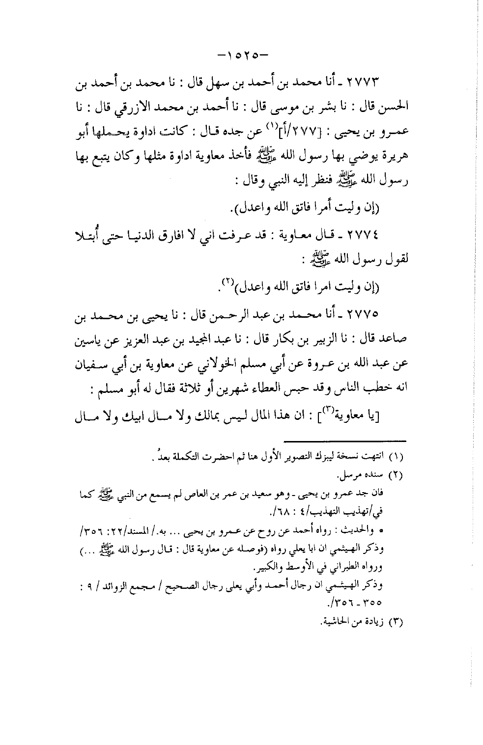 2773 - أنا مُحَمَّدُ بْنُ أَحْمَدَ بْنِ سَهْلٍ، قَالَ: نا مُحَمَّدُ بْنُ أَحْمَدَ بْنِ الْحَسَنِ، قَالَ: نا بِشْرُ بْنُ مُوسَى، قَالَ: نا أَحْمَدُ بْنُ مُحَمَّدٍ الْأَزْرَقِيُّ، قَالَ: نا عَمْرُو بْنُ يَحْيَى، عَنْ جَدِّهِ، قَالَ: كَانَتِ إِدْوَاةٌ يَحْمِلُهَا أَبُو هُرَيْرَةَ يُوَضِّئُ بِهَا رَسُولَ اللَّهِ صَلَّى اللهُ عَلَيْهِ وَسَلَّمَ، فَأَخَذَ مُعَاوِيَةُ إِدْوَاةً مِثْلَهَا، وَكَانَ يَتَّبِعُ بِهَا رَسُولَ اللَّهِ صَلَّى اللهُ عَلَيْهِ وَسَلَّمَ، فَنَظَرَ إِلَيْهِ النَّبِيُّ، وَقَالَ: «§إِنْ وُلِّيتَ أَمْرًا فَاتَّقِ اللَّهَ وَاعْدِلْ»