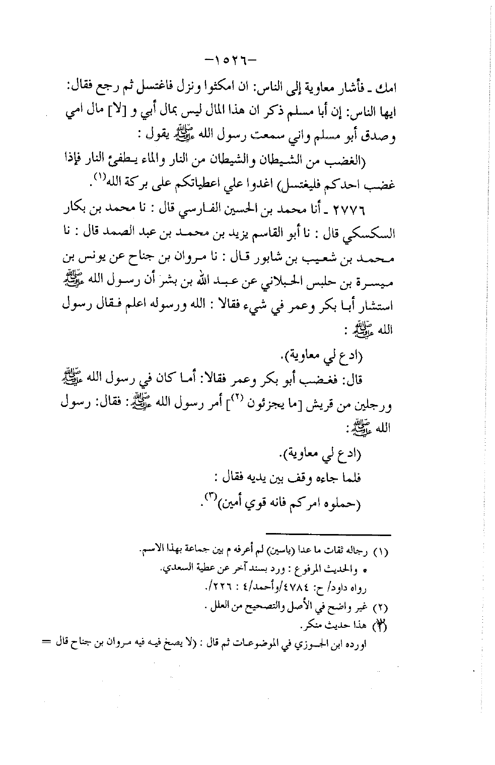 2776 - أنا مُحَمَّدُ بْنُ الْحُسَيْنِ الْفَارِسِيُّ، قَالَ: نا مُحَمَّدُ بْنُ. . . . السَّكْسِيُّ، قَالَ: نا أَبُو الْقَاسِمِ يَزِيدُ بْنُ مُحَمَّدِ بْنِ عَبْدِ الصَّمَدِ، قَالَ: نا مُحَمَّدُ بْنُ شُعَيْبِ بْنِ شَابُورَ، قَالَ: نا مَرْوَانُ بْنُ جَنَاحٍ، عَنْ يُونُسَ بْنِ مَيْسَرَةَ بْنِ حَلْبَسٍ الْحُبُلَانِيِّ، عَنْ عَبْدِ اللَّهِ بْنِ بِشْرٍ، أَنَّ رَسُولَ اللَّهِ صَلَّى اللهُ عَلَيْهِ وَسَلَّمَ اسْتَشَارَ أَبَا بَكْرٍ وَعُمَرَ فِي شَيْءٍ، فَقَالَا: اللَّهُ وَرَسُولُهُ أَعْلَمُ. فَقَالَ رَسُولُ اللَّهِ صَلَّى اللهُ عَلَيْهِ وَسَلَّمَ: «ادْعُ لِي مُعَاوِيَةَ» . قَالَ: فَغَضِبَ أَبُو بَكْرٍ وَعُمَرُ، فَقَالَا: أَمَا كَانَ فِي رَسُولِ اللَّهِ صَلَّى اللهُ عَلَيْهِ وَسَلَّمَ وَرَجُلَيْنِ مِنْ قُرَيْشٍ مَا يَجِدُونَ أَمْرَ رَسُولِ اللَّهِ صَلَّى اللهُ عَلَيْهِ وَسَلَّمَ؟ فَقَالَ رَسُولُ اللَّهِ صَلَّى اللهُ عَلَيْهِ وَسَلَّمَ: «ادْعُ لِي مُعَاوِيَةَ» . فَلَمَّا جَاءَهُ وَقَفَ بَيْنَ يَدَيْهِ، فَقَالَ: §«حَمِّلُوهُ أَمْرَكُمْ؛ فَإِنَّهُ قَوِيٌّ أَمِينٌ»