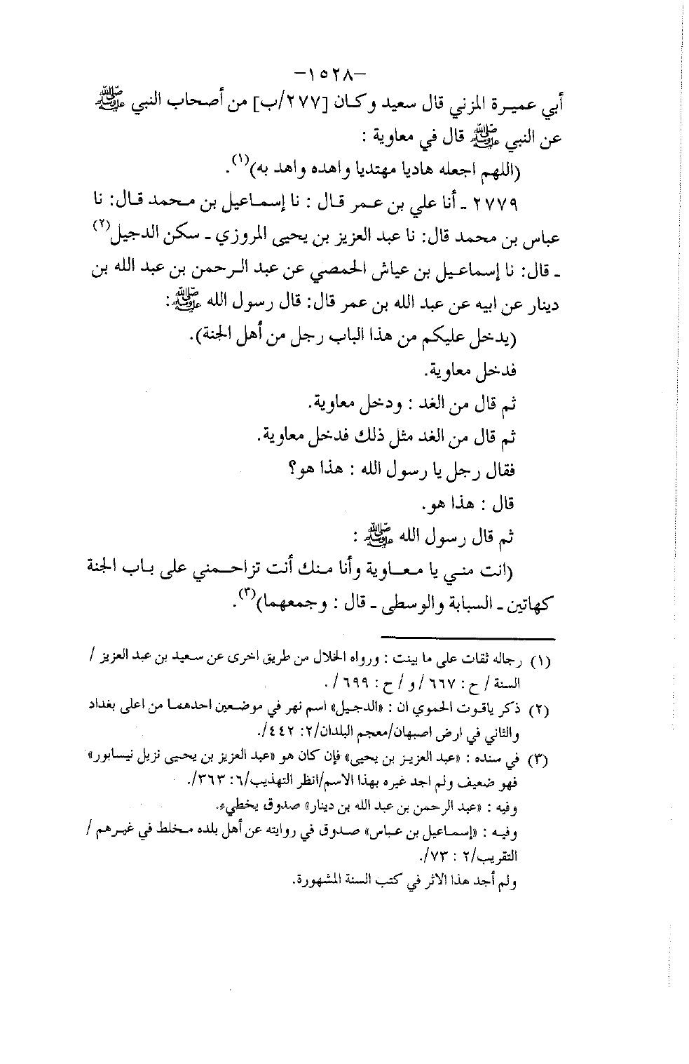 2779 - أنا عَلِيُّ بْنُ عُمَرَ، قَالَ: نا إِسْمَاعِيلُ بْنُ مُحَمَّدٍ، قَالَ: نا عَبَّاسُ بْنُ مُحَمَّدٍ، قَالَ: نا عَبْدُ الْعَزِيزِ بْنُ يَحْيَى الْمَرْوَزِيُّ، سَكَنَ الدُّجَيْلَ، قَالَ: نا إِسْمَاعِيلُ بْنُ عَيَّاشٍ الْحِمْصِيُّ، عَنْ عَبْدِ الرَّحْمَنِ بْنِ عَبْدِ اللَّهِ بْنِ دِينَارٍ، عَنْ عَبْدِ اللَّهِ بْنِ عُمَرَ، قَالَ: قَالَ رَسُولُ اللَّهِ صَلَّى اللهُ عَلَيْهِ وَسَلَّمَ: «يَدْخُلُ عَلَيْكُمْ مِنْ هَذَا الْبَابِ رَجُلٌ مِنْ أَهْلِ الْجَنَّةِ» . فَدَخَلَ مُعَاوِيَةُ، ثُمَّ قَالَ مِنَ الْغَدِ وَدَخَلَ مُعَاوِيَةُ، ثُمَّ قَالَ مِنَ الْغَدِ مِثْلَ ذَلِكَ فَدَخَلَ مُعَاوِيَةُ، فَقَالَ رَجُلٌ: يَا رَسُولَ اللَّهِ: هَذَا هُوَ؟ قَالَ: «هَذَا هُوَ» . ثُمَّ قَالَ رَسُولُ اللَّهِ صَلَّى اللهُ عَلَيْهِ وَسَلَّمَ: «§أَنْتَ مِنِّي يَا مُعَاوِيَةُ وَأَنَا مِنْكَ، أَنْتَ تُزَاحِمُنِي عَلَى بَابِ الْجَنَّةِ كَهَاتَيْنِ» السَّبَّابَةِ وَالْوُسْطَى قَالَ: وَجَمَعَهُمَا