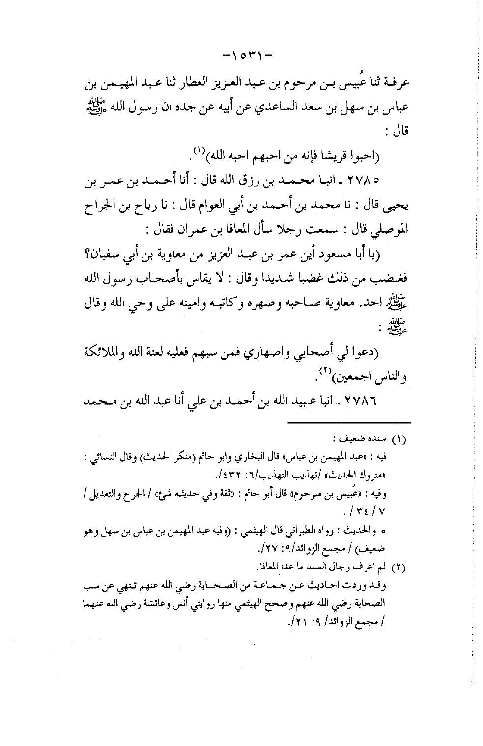 2785 - أنبأ مُحَمَّدُ بْنُ رِزْقِ اللَّهِ، قَالَ: أنا أَحْمَدُ بْنُ عُمَرَ بْنِ يَحْيَى، قَالَ: نا مُحَمَّدُ بْنُ أَحْمَدَ بْنِ أَبِي الْعَوَّامِ، قَالَ: نا رِيَاحُ بْنُ الْجَرَّاحِ الْمَوْصِلِيُّ، قَالَ: سَمِعْتُ رَجُلًا سَأَلَ الْمُعَافَى بْنَ عِمْرَانَ، فَقَالَ: يَا أَبَا مَسْعُودٍ أَيْنَ عُمَرُ بْنُ عَبْدِ الْعَزِيزِ مِنْ مُعَاوِيَةَ بْنِ أَبِي سُفْيَانَ؟ فَغَضِبَ مِنْ ذَلِكَ غَضَبًا شَدِيدًا، وَقَالَ: لَا يُقَاسُ بِأَصْحَابِ رَسُولِ اللَّهِ صَلَّى اللهُ عَلَيْهِ وَسَلَّمَ أَحَدٌ، مُعَاوِيَةُ صَاحِبُهُ، وَصِهْرُهُ، وَكَاتِبُهُ، وَأَمِينُهُ عَلَى وَحْيِ اللَّهِ، وَقَالَ صَلَّى اللهُ عَلَيْهِ وَسَلَّمَ: «§دَعُوا لِي أَصْحَابِي وَأَصْهَارِي، فَمَنْ سَبَّهُمْ فَعَلَيْهِ لَعْنَةُ اللَّهِ وَالْمَلَائِكَةِ وَالنَّاسِ أَجْمَعِينَ»