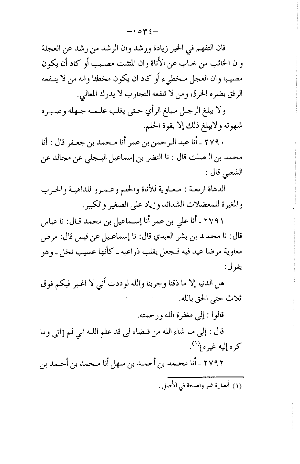2790 - أنا عَبْدُ الرَّحْمَنِ بْنُ عُمَرَ، أنا مُحَمَّدُ بْنُ جَعْفَرٍ، قَالَ: أنا مُحَمَّدُ بْنُ الصَّلْتِ، قَالَ: نا النَّضْرُ بْنُ إِسْمَاعِيلَ الْبَجَلِيُّ، عَنْ مُجَالِدٍ، عَنِ الشَّعْبِيِّ، قَالَ: §الدُّهَاةُ أَرْبَعَةٌ: مُعَاوِيَةُ لِلْأَنَاةِ وَالْحِلْمِ، وَعَمْرٌو لِلدَّاهِيَةِ وَالْحَرْبِ، وَالْمُغِيرَةُ لِلْمُعْضِلَاتِ الشَّدَائِدِ، وَزِيَادٌ عَلَى الصَّغِيرِ وَالْكَبِيرِ