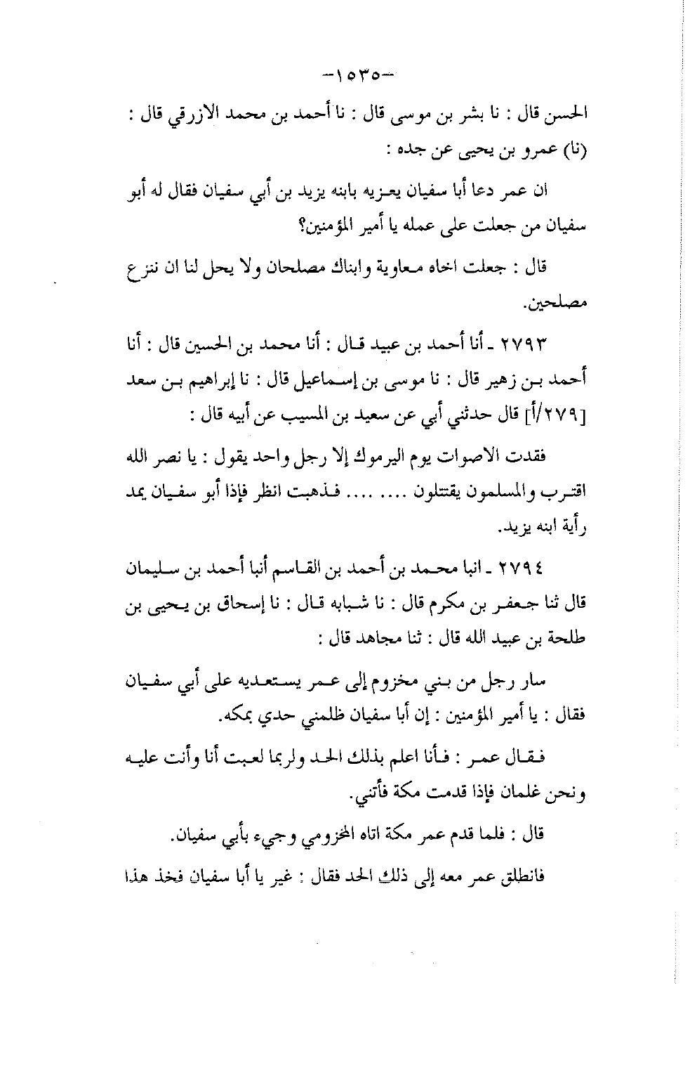 2793 - أنا أَحْمَدُ بْنُ عُبَيْدٍ، قَالَ: أنا مُحَمَّدُ بْنُ الْحُسَيْنِ، قَالَ: أنا أَحْمَدُ بْنُ زُهَيْرٍ، قَالَ: نا مُوسَى بْنُ إِسْمَاعِيلَ، قَالَ: نا إِبْرَاهِيمُ بْنُ سَعْدٍ، قَالَ: حَدَّثَنِي أَبِي، عَنْ سَعِيدِ بْنِ الْمُسَيِّبِ، عَنْ أَبِيهِ، قَالَ: " §فُقِدَتِ الْأَصْوَاتُ يَوْمَ الْيَرْمُوكِ إِلَّا رَجُلًا وَاحِدًا يَقُولُ: يَا نَصْرَ اللَّهِ اقْتَرِبْ، وَالْمُسْلِمُونَ يَقْتَتِلُونَ. . .، فَذَهَبْتُ أَنْظُرُ، فَإِذَا أَبُو سُفْيَانَ. . . ابْنُهُ يَزِيدَ
