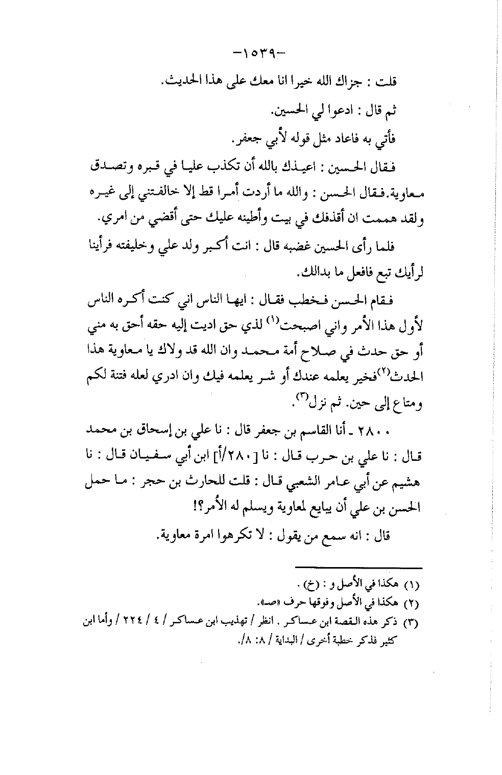 2800 - أنا الْقَاسِمُ بْنُ جَعْفَرٍ، قَالَ: نا عَلِيُّ بْنُ إِسْحَاقَ بْنِ مُحَمَّدٍ، قَالَ: نا عَلِيُّ بْنُ حَرْبٍ، قَالَ: نا ابْنُ أَبِي سُفْيَانَ، قَالَ: نا هُشَيْمٌ، عَنْ أَبِي عَامِرٍ الشَّعْبِيِّ، قَالَ: قُلْتُ لِلْحَارِثِ بْنِ حُجْرٍ: مَا حَمَلَ الْحَسَنَ بْنَ عَلِيٍّ أَنْ يُبَايِعَ لِمُعَاوِيَةَ وَيُسَلِّمَ لَهُ الْأَمْرَ؟ قَالَ: إِنَّهُ سَمِعَ مَنْ يَقُولُ: §لَا تَكْرَهُوا إِمْرَةَ مُعَاوِيَةَ
