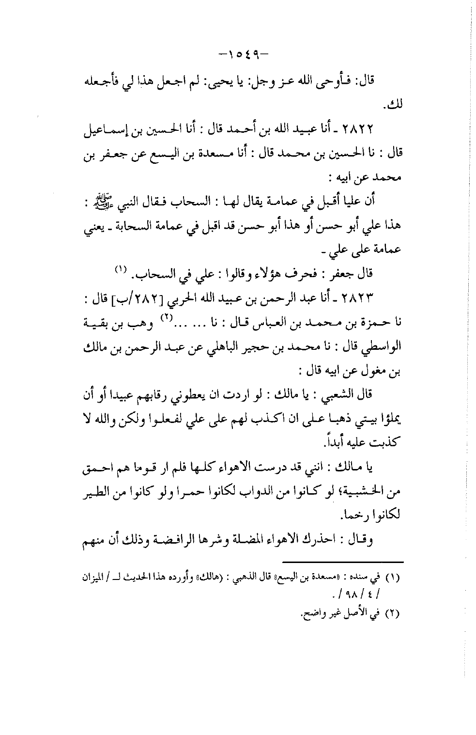 2822 - أنا عُبَيْدُ اللَّهِ بْنُ أَحْمَدَ، قَالَ: أنا الْحُسَيْنُ بْنُ إِسْمَاعِيلَ، قَالَ: نا الْحُسَيْنُ بْنُ مُحَمَّدٍ، قَالَ: أنا مَسْعَدَةُ بْنُ الْيَسَعِ، عَنْ جَعْفَرِ بْنِ مُحَمَّدٍ، عَنْ أَبِيهِ، أَنَّ عَلِيًّا أَقْبَلَ فِي عِمَامَةٍ يُقَالُ لَهَا السَّحَابُ فَقَالَ النَّبِيُّ صَلَّى اللهُ عَلَيْهِ وَسَلَّمَ: «هَذَا عَلِيٌّ أَبُو حَسَنٍ» أَوْ هَذَا أَبُو حَسَنٍ §قَدْ أَقْبَلَ فِي عِمَامَةِ السَّحَابَةِ " يَعْنِي عِمَامَةً عَلَى عَلِيٍّ. قَالَ جَعْفَرٌ: فَحَرَّفَ هَؤُلَاءِ، وَقَالُوا: عَلِيٌّ فِي السَّحَابِ